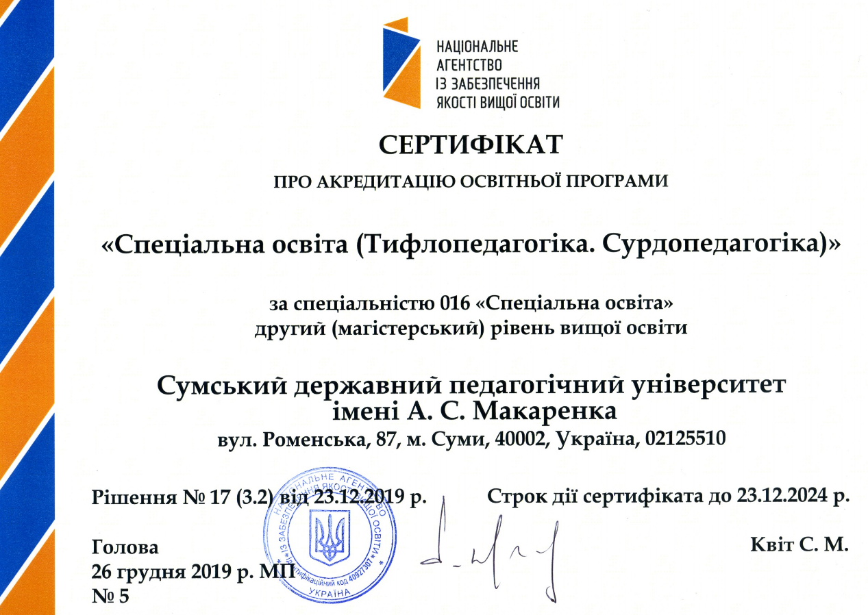 Сертифікат про акредитацію ОП Спеціальна освіта (Тифлопедагогіка. Сурдопедагогіка) №17(3.2) від 23.12.2019 р. Другий (магістерський) рівень вищої освіти. Строк дії сертифіката до 23.12.2024 р.