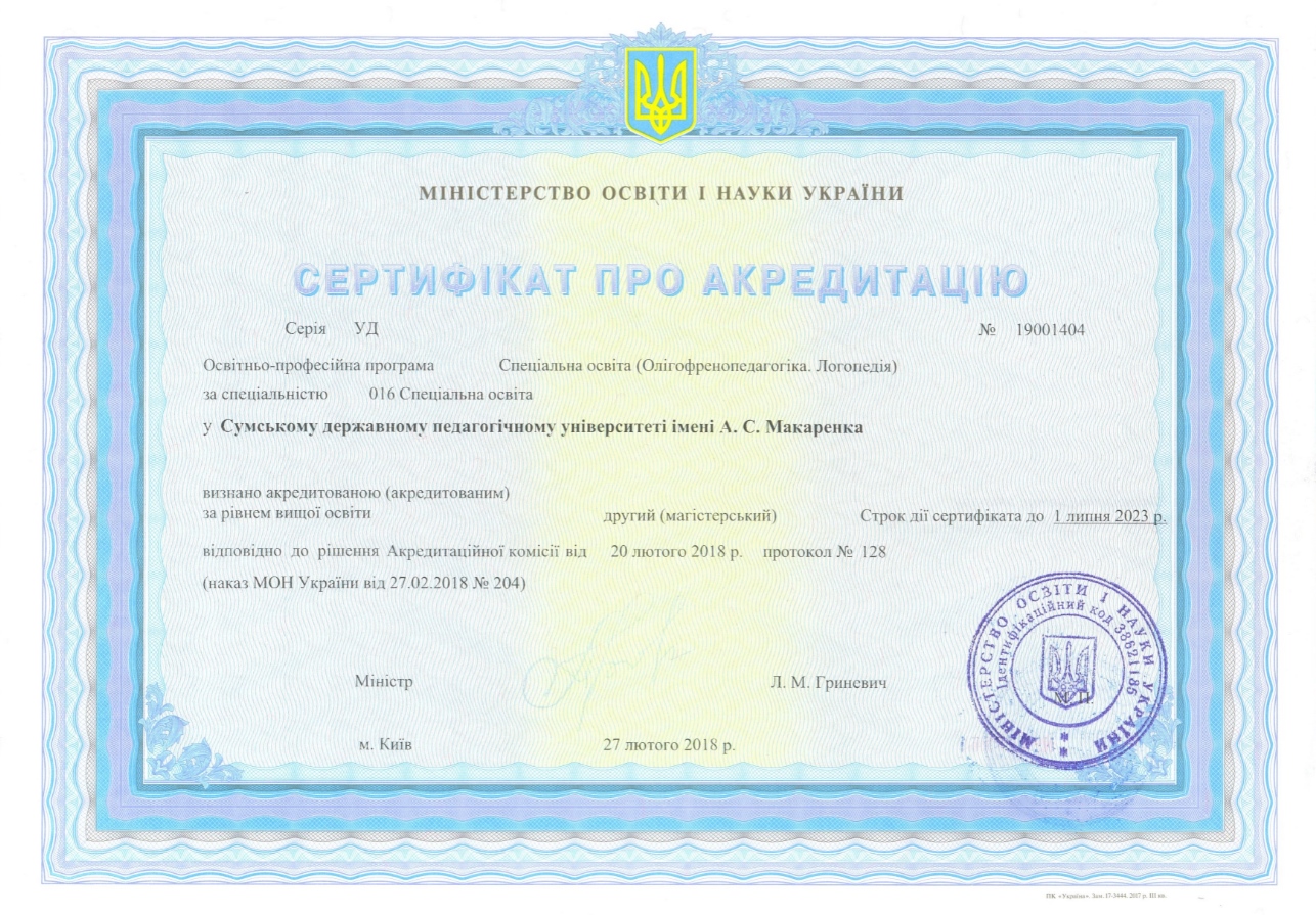Сертифікат про акредитацію ОП Спеціальна освіта (Олігофренопедагогіка. Логопедія) серія УД №19001404 від 27 лютого 2018 р. Другий (магістерський) рівень вищої освіти. Строк дії сертифіката до 1 липня 2023 року.