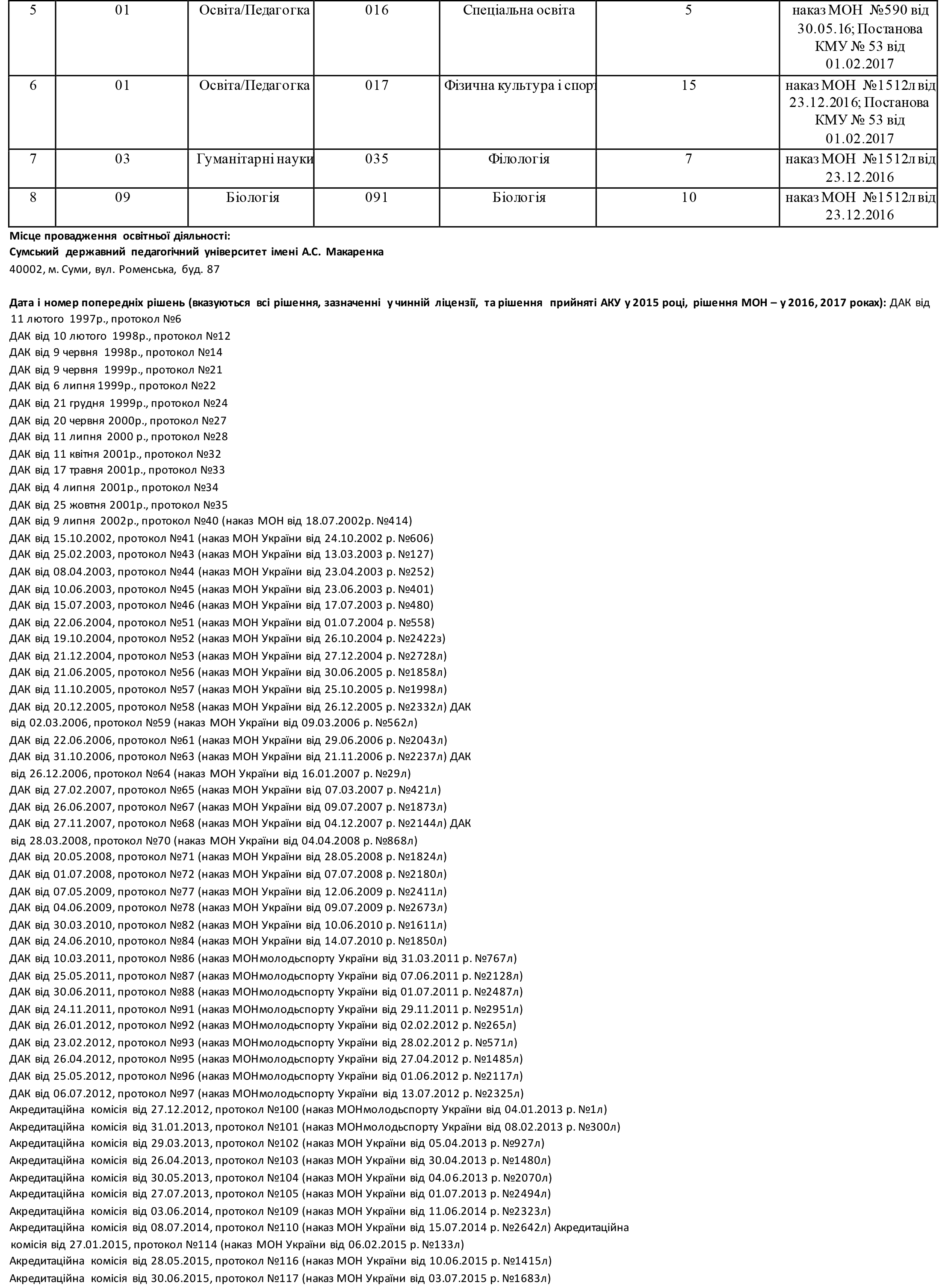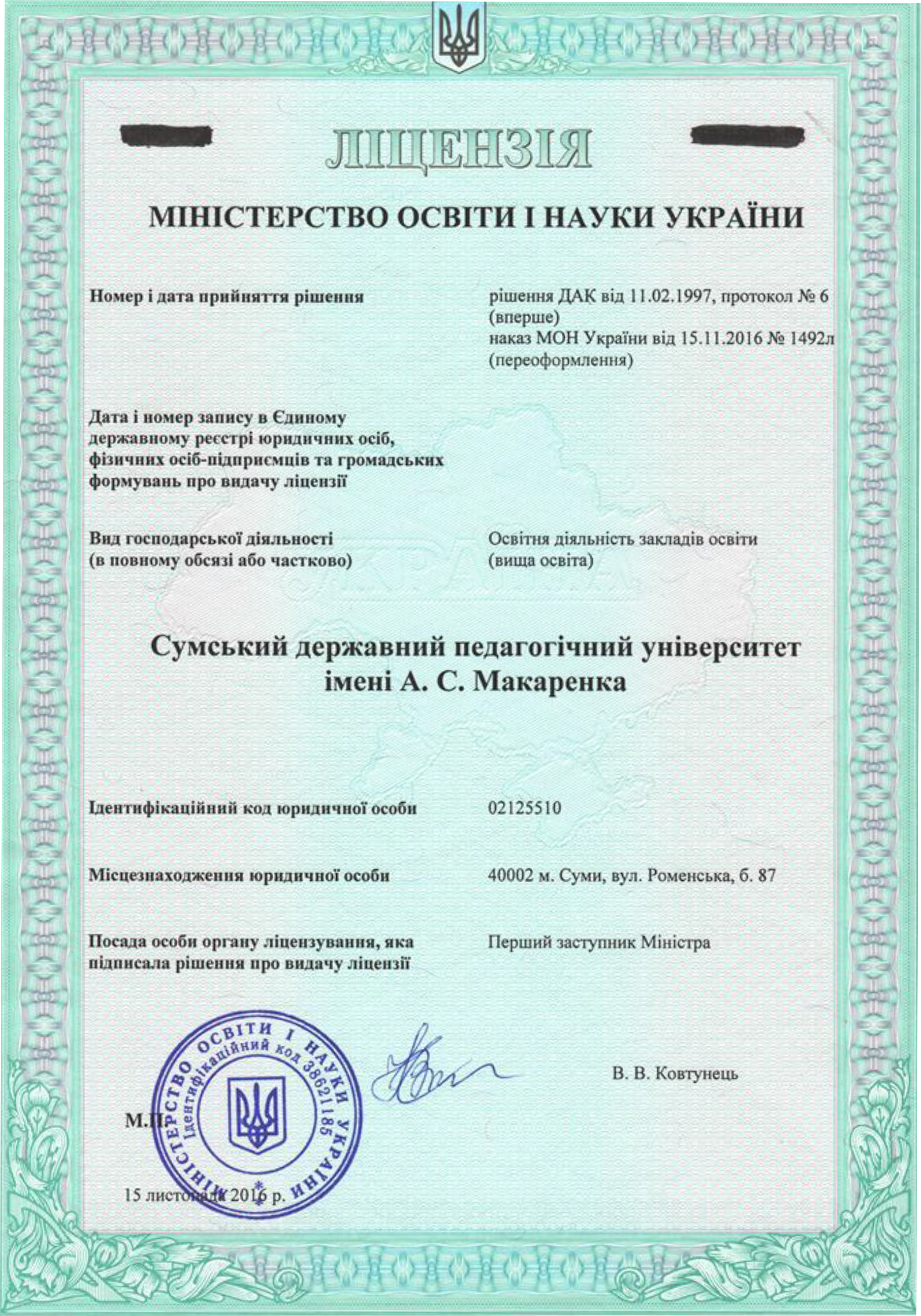 Сумський державний педагогічний університет імені А.С. Макаренка відповідно до рішення ДАК від 11.02.1997, протокол №6 та наказу МОН України від 15.11.2016 №1492л має ліцензію (див.ліцензований обсяг) та визнано акредитованим за статусом вищого навчального закладу IV (четвертого) рівня.