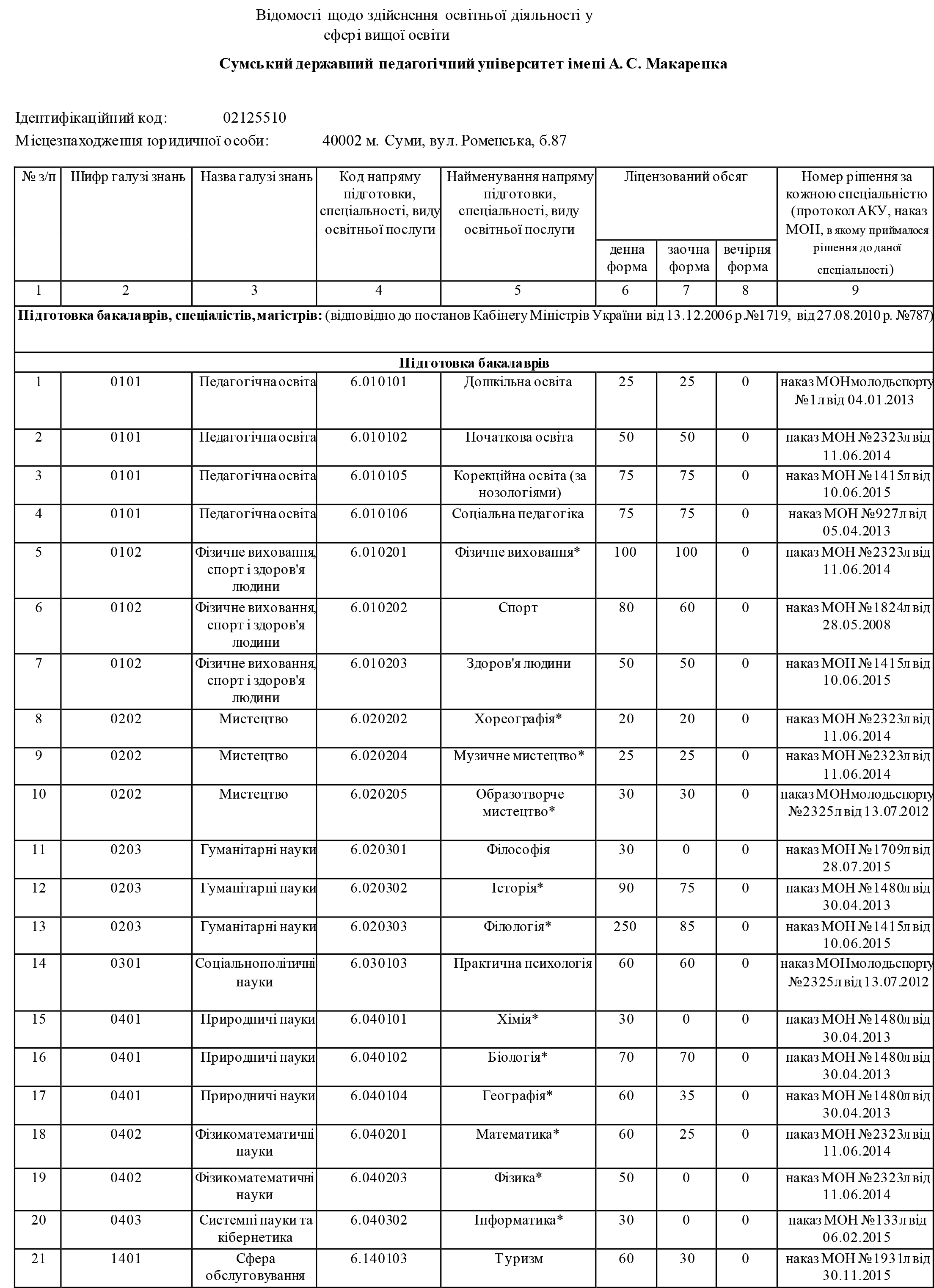 Сумський державний педагогічний університет імені А.С. Макаренка має ліцензію Міністерства освіти і науки України на підготовку бакалаврів за спеціальністю 016 Спеціальна освіта.