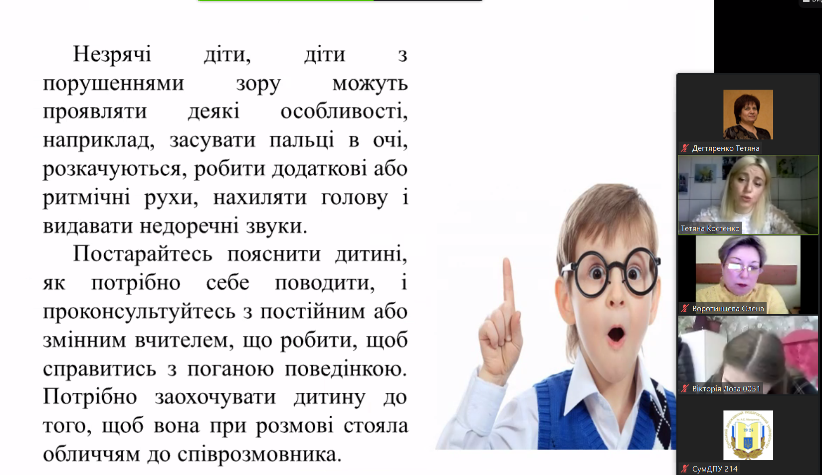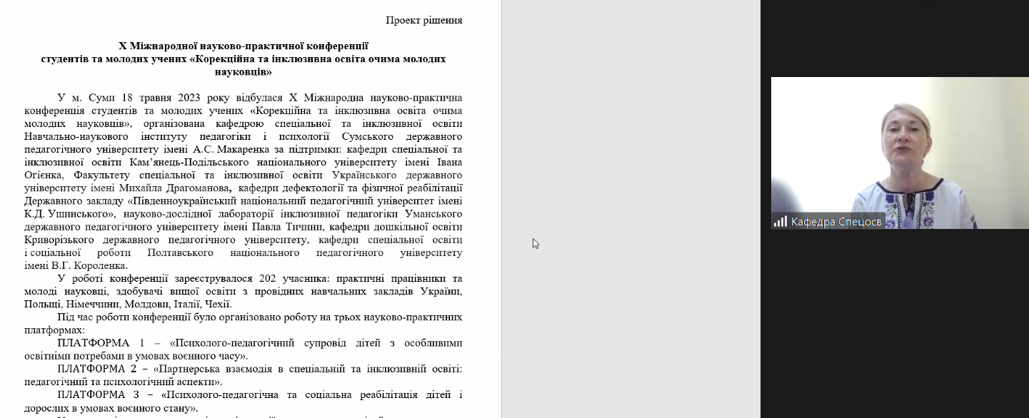 Окрему увагу було приділено питанню підготовки педагогічних працівників для роботи з дітьми з особливими освітніми потребами, про яке інформувала завідувач кафедри спеціальної та інклюзивної освіти Сумського державного педагогічного університету імені А.С. Макаренка Тетяна ДЕГТЯРЕНКО.
