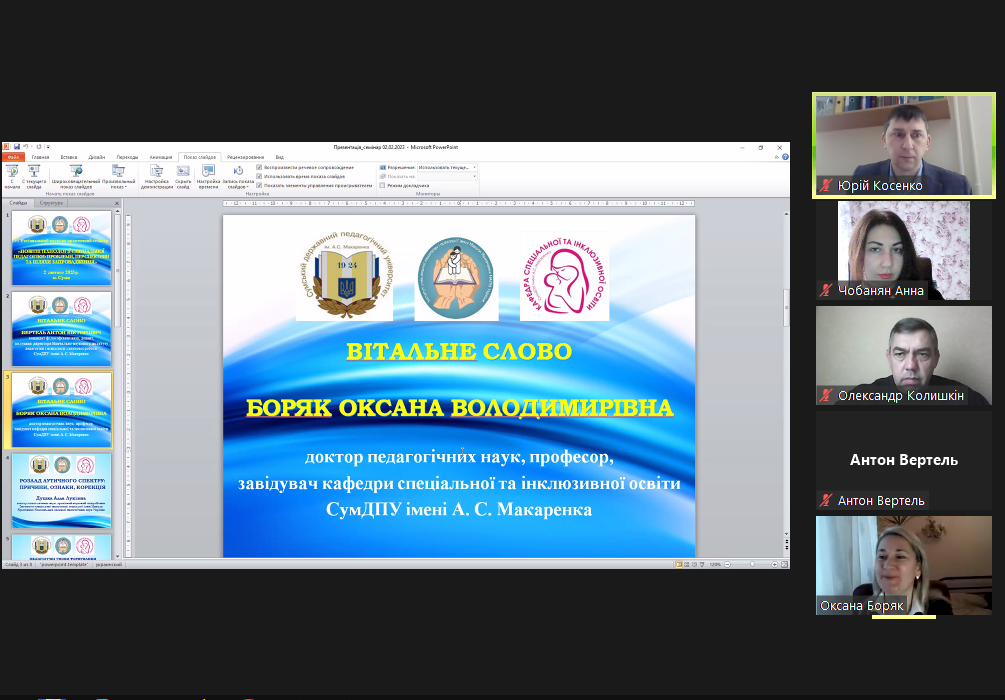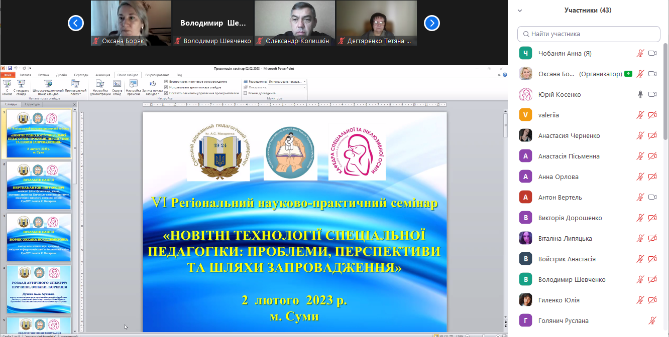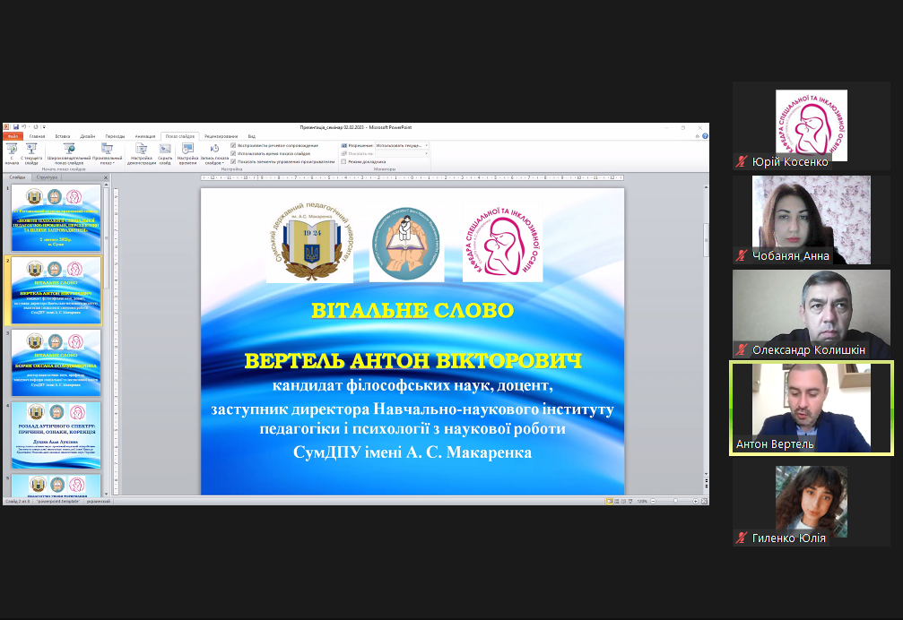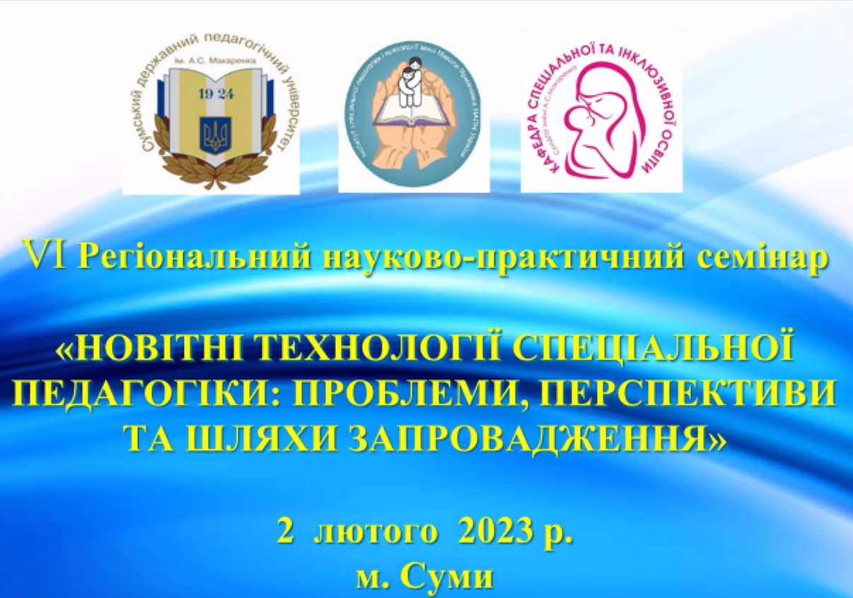 05 березня 2024 року кафедрою спеціальної та інклюзивної освіти СумДПУ імені А. С. Макаренка спільно з Інститутом спеціальної педагогіки і психології імені Миколи Ярмаченка НАПН України було проведено Всеукраїнський науково-практичний семінар «Інноваційні технології у спеціальній та інклюзивній освіті: шляхи розвитку та впровадження».
