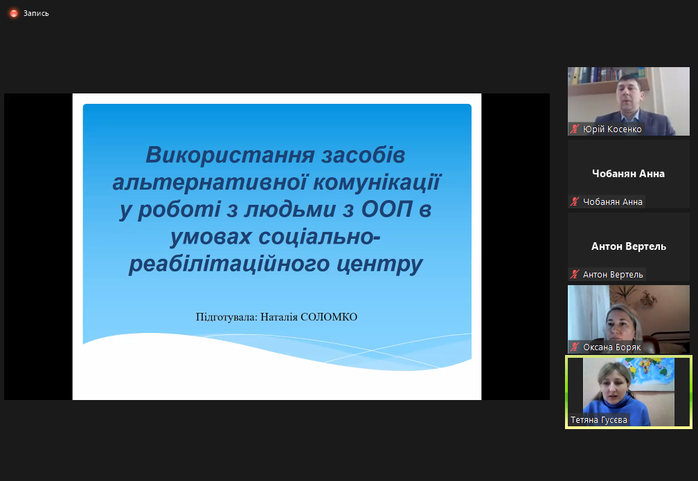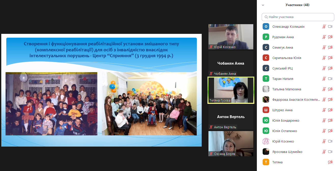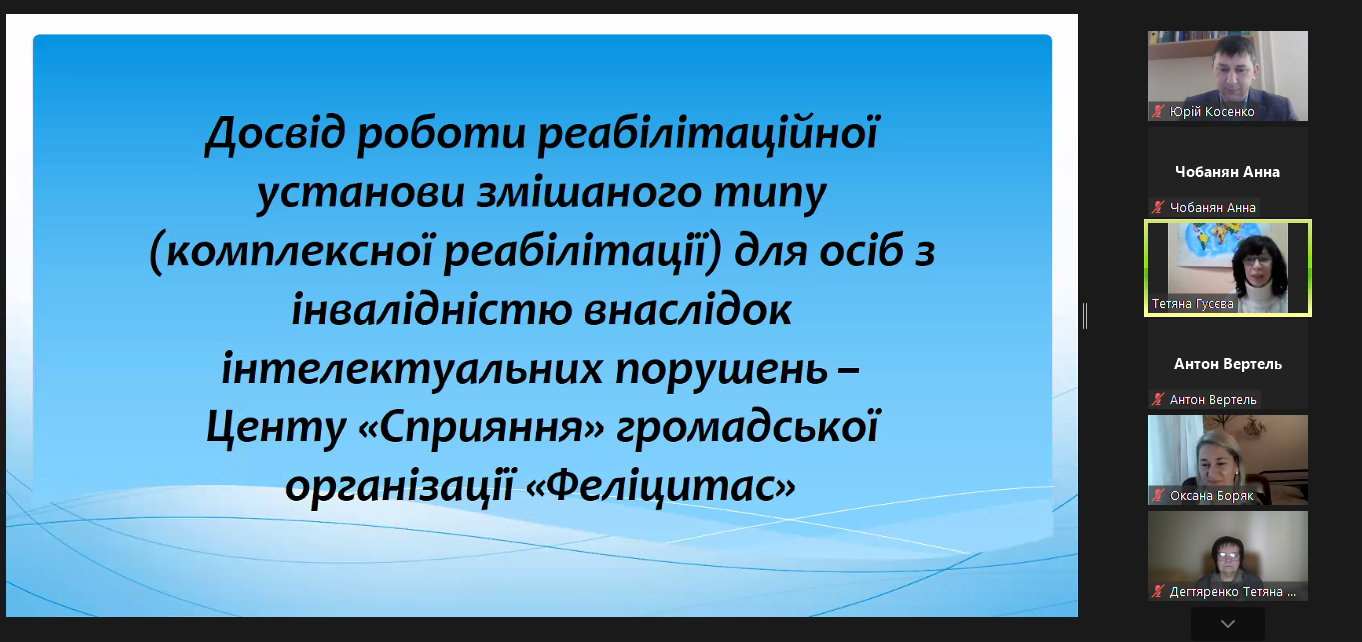 Поділилася 25-річним досвідом роботи з особами, які мають важкі порушення інтелекту директор реабілітаційної установи змішаного типу (комплексної реабілітації) для осіб з інвалідністю внаслідок інтелектуальних порушень – Центр «Сприяння» Гусєва Тетяна Олексіївна.