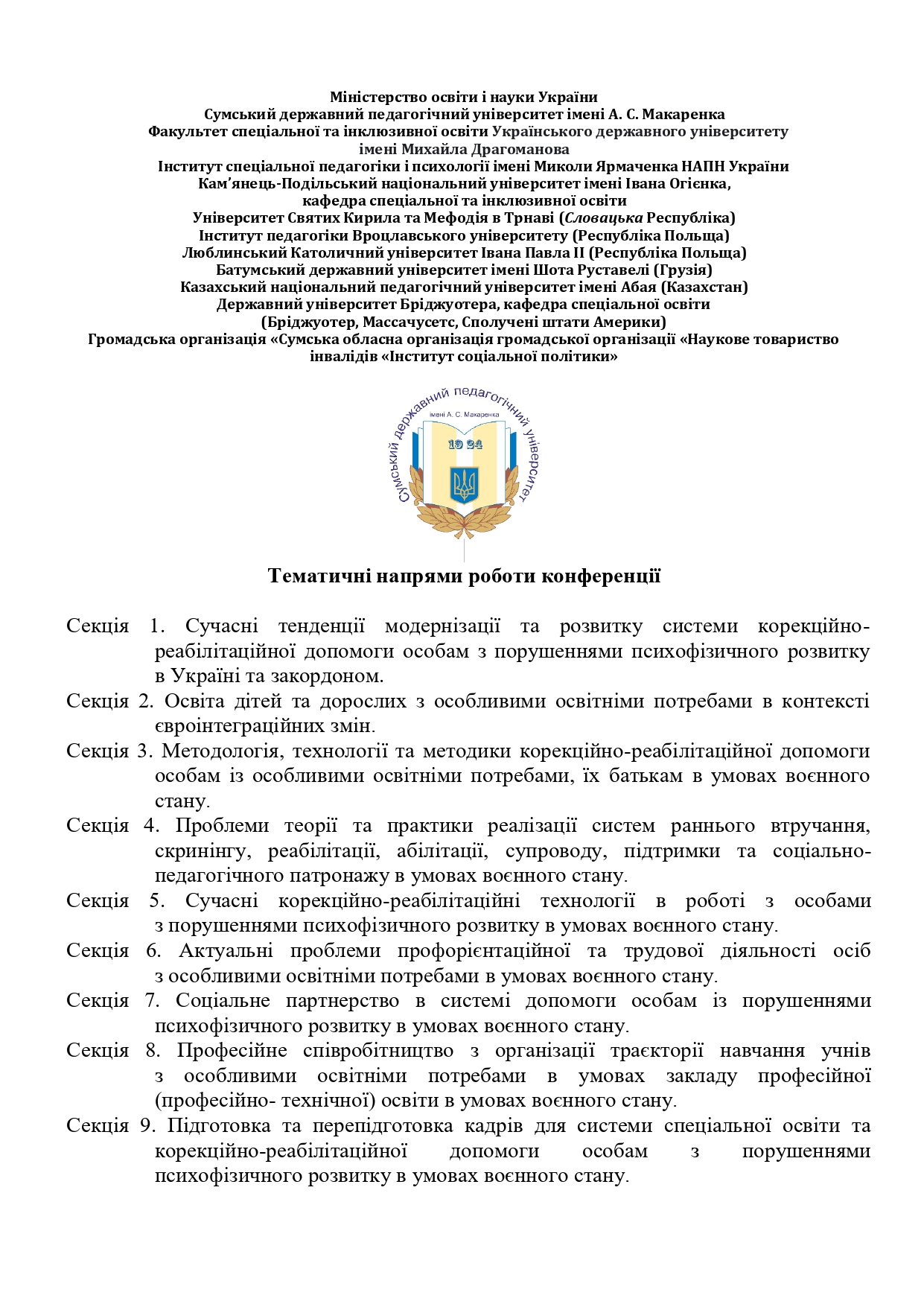 22 травня 2025 року на базі кафедри спеціальної та інклюзивної освіти Навчально-наукового інституту педагогіки і психології Сумського державного педагогічного університету імені А.С. Макаренка відбулася ХІІ Міжнародна науково-практична конференція студентів та молодих учених «Корекційна та інклюзивна освіта очима молодих науковців», присвячена 20-річчю кафедри спеціальної та інклюзивної освіти Сумського державного педагогічного університету імені А.С. Макаренка.