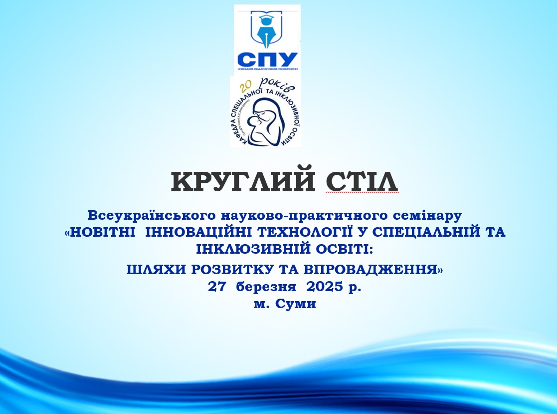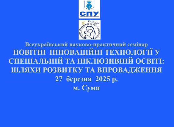 27 березня 2025 року кафедрою спеціальної та інклюзивної освіти Навчально-наукового інституту педагогіки і психології Сумського державного педагогічного університету імені А. С. Макаренка було проведено Всеукраїнський науково-практичний семінар «Інноваційні технології у спеціальній та інклюзивній освіті: шляхи розвитку та впровадження».