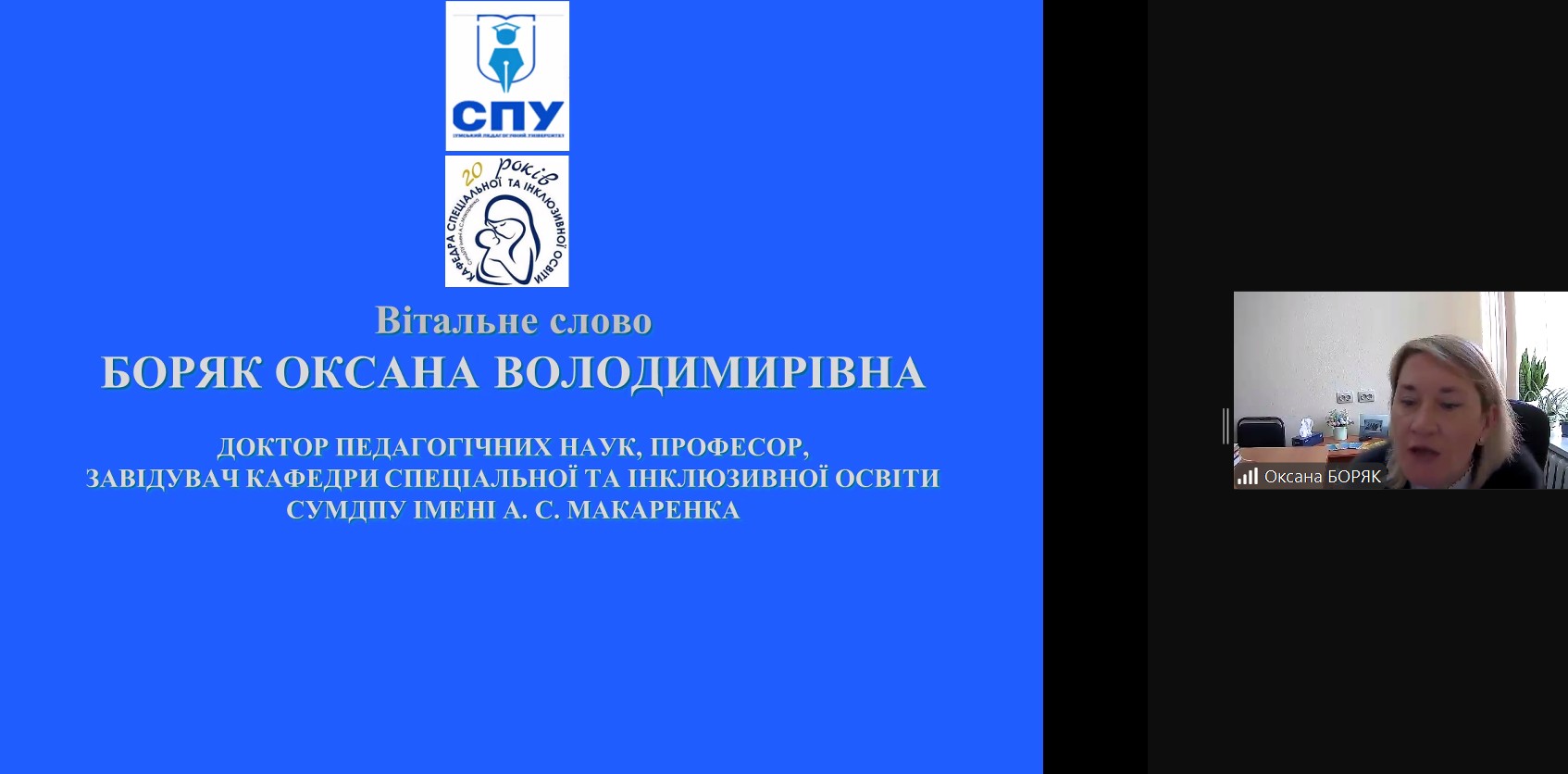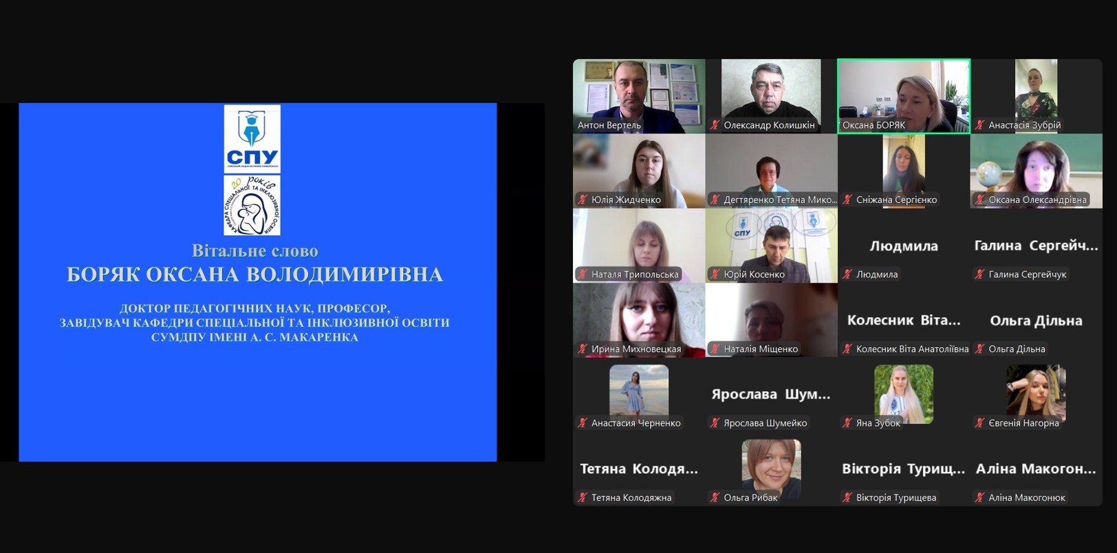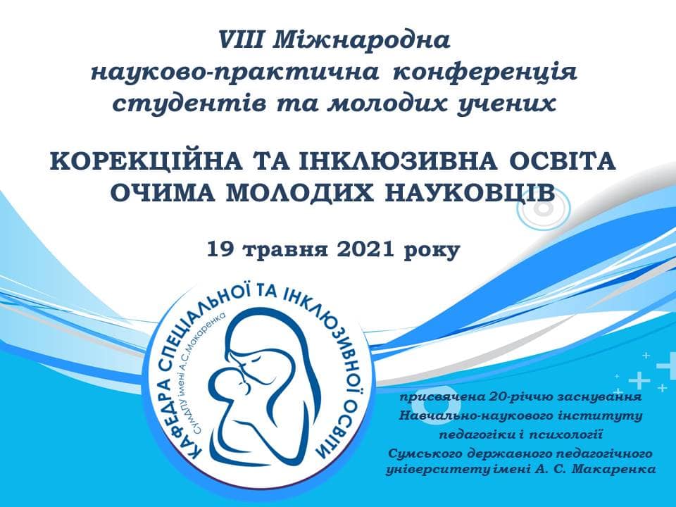 19 травня 2021 року на базі кафедри спеціальної та інклюзивної освіти Сумського державного педагогічного університету імені А.С. Макаренка відбулася в онлайн форматі VІІІ Міжнародна науково-практична конференція студентів та молодих учених «Корекційна та інклюзивна освіта очима молодих науковців» (Координатор – д-р пед. наук, професор Боряк О.В.).