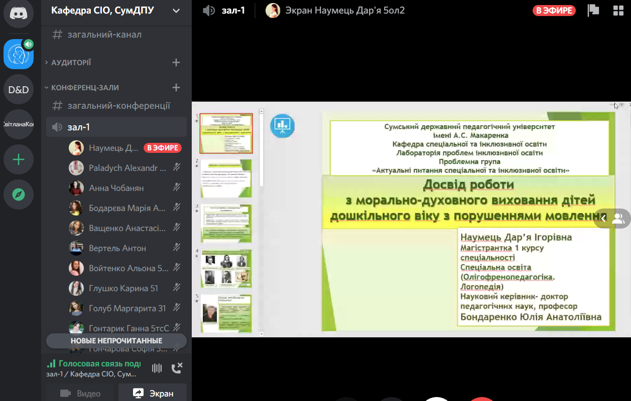 23 березня 2021 року на базі кафедри спеціальної та інклюзивної освіти СумДПУ ім. А.С. Макаренка відбулася online-конференція Наукового товариства студентів, аспірантів, докторантів та молодих учених. Голова Наукового товариства – канд. економ. наук, доц. кафедри бізнес-економіки та адміністрування Омельяненко Віталій Анатолійович у своїй доповіді окреслив основні напрями роботи товариства та ознайомив з головними здобутками молодих учених університету і перспективою реалізації наукового потенціалу молодих науковців у напрямі міжнародної грантової діяльності, патентної роботи, вагомих публікацій, участі у наукових заходах, наголосив на дотриманні принципів академічної доброчесності усіх учасників освітнього процесу. Секретарем Наукового товариства – канд. пед. наук, завідувачем методично-організаційним відділом Мартиненко Дар'єю Володимирівною акцентовано увагу на організаційних аспектах діяльності цього товариства.