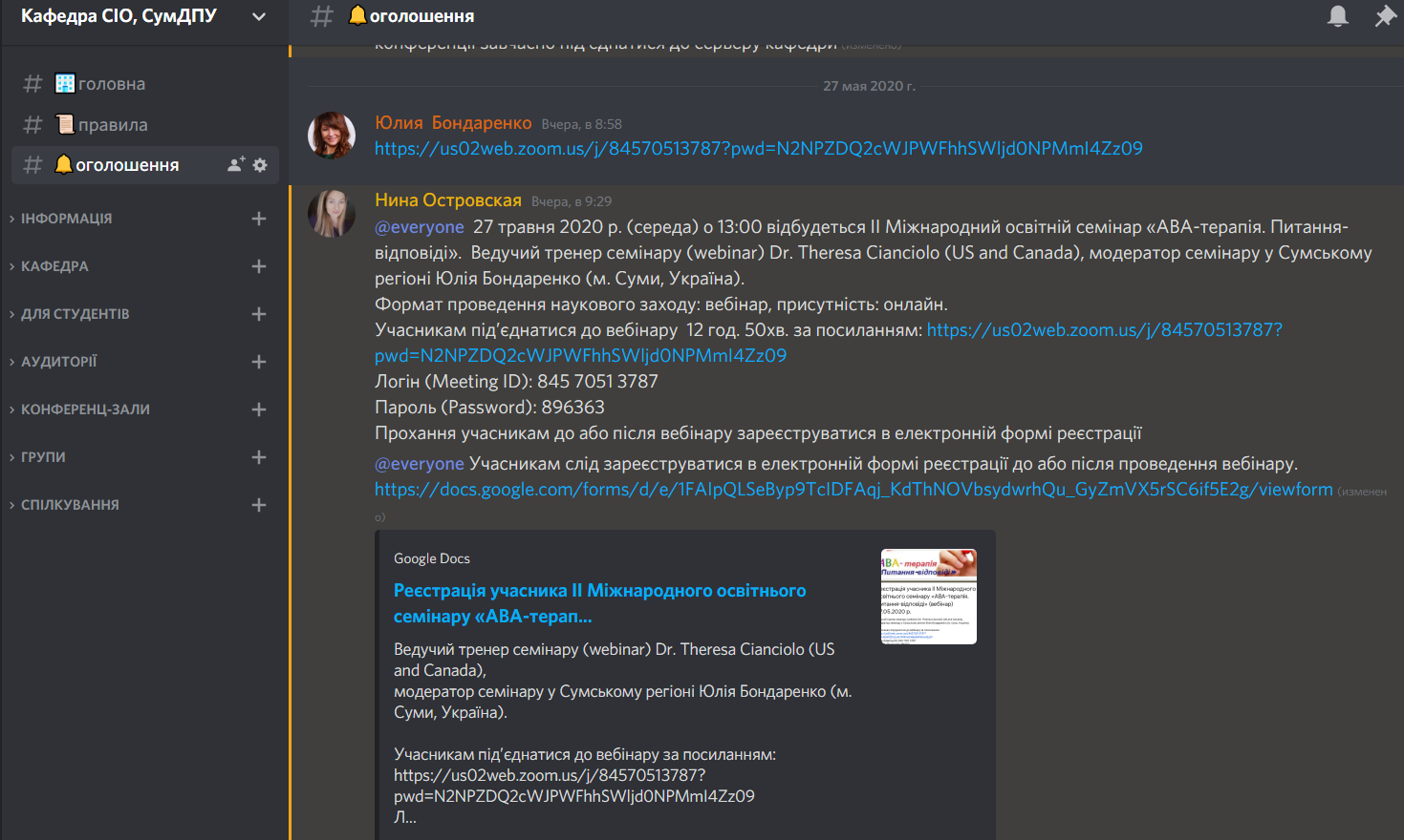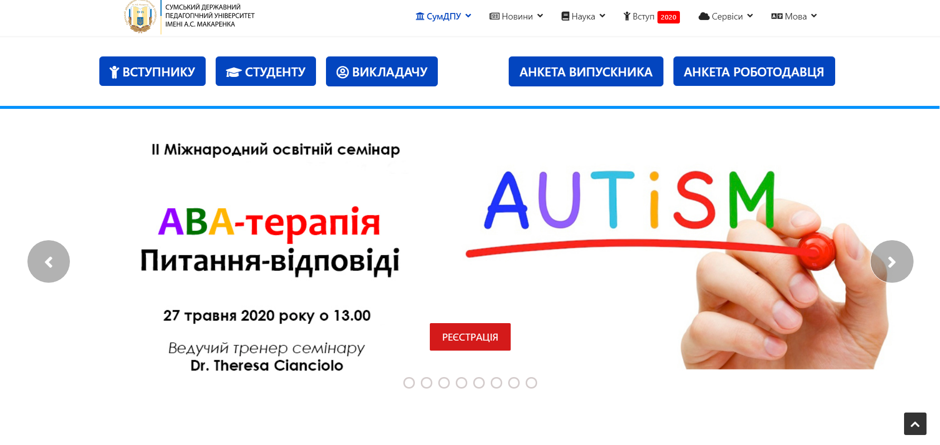 27 травня 2020 року науково-дослідною лабораторією проблем інклюзивної освіти кафедри спеціальної та інклюзивної освіти Сумського державного педагогічного університету імені А.С. Макаренка (завідувач лабораторії д-р пед.наук, проф. Бондаренко Ю.А.) проведено Міжнародний освітній семінар «АВА-терапія. Питання-відповіді». Участниками стали вчителі-дефектологи, практичні психологи, педагогічні працівники закладів спеціальної освіти та з інклюзивним навчанням, фахівці ІРЦ, центрів розвитку дітей, спеціалісти, які працюють в реабілітаційних центрах, громадських організаціях, батьки дітей з особливими освітніми потребами, зокрема з РАС, викладачі, студенти ЗВО.