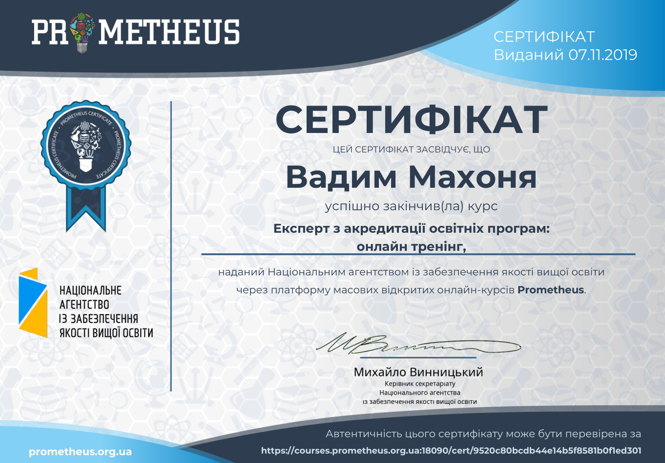 Махоня Вадим Ігорович - експерт з 016 Спеціальна освіта. Сертифікат експерта з «07» листопада 2019 р.