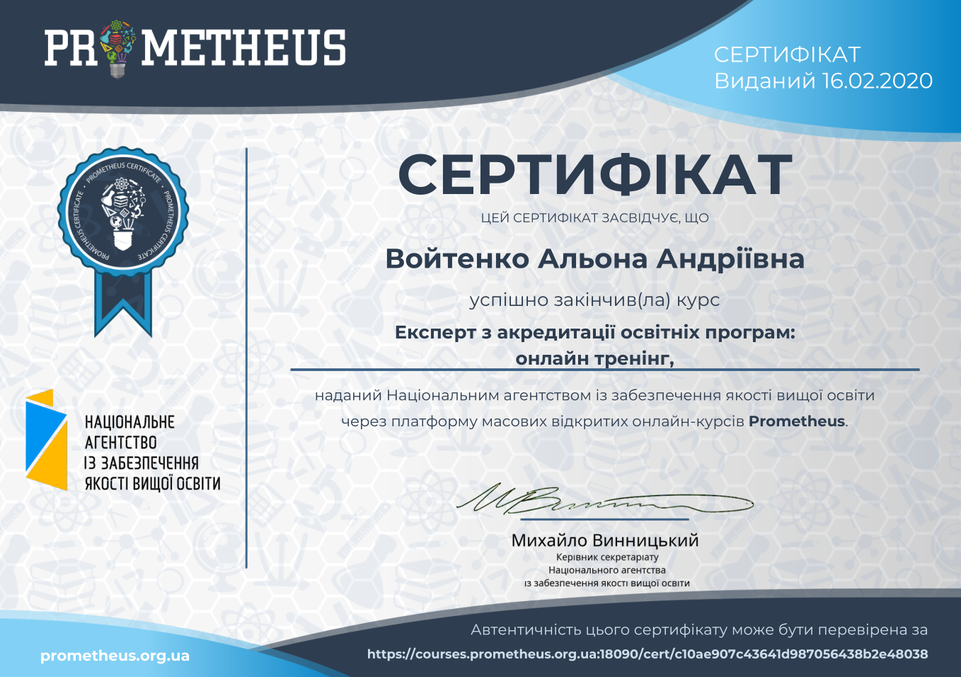 Войтенко Альона Андріївна - експерт з 016 Спеціальна освіта. Сертифікат експерта з «16»лютого 2020 р.