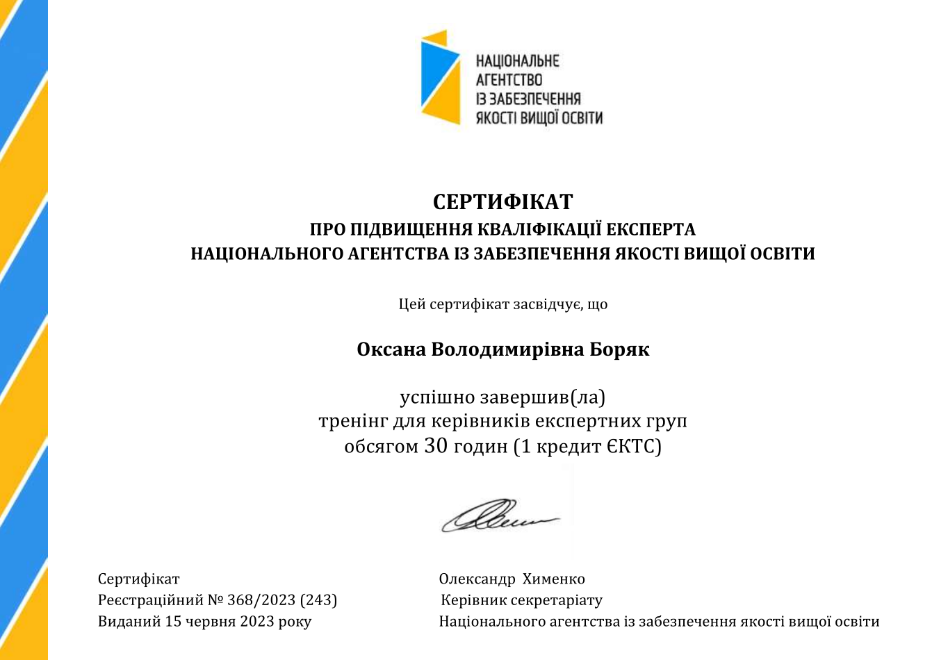 15 червня 2023 року завідувач-професор кафедри, професор Оксана БОРЯК успішно завершила тренінг підвищення кваліфікації для керівників експертних груп Національного агенства із забезпечення якості вищої освіти, обсягом 30 годин (1 кредит ЄКТС).