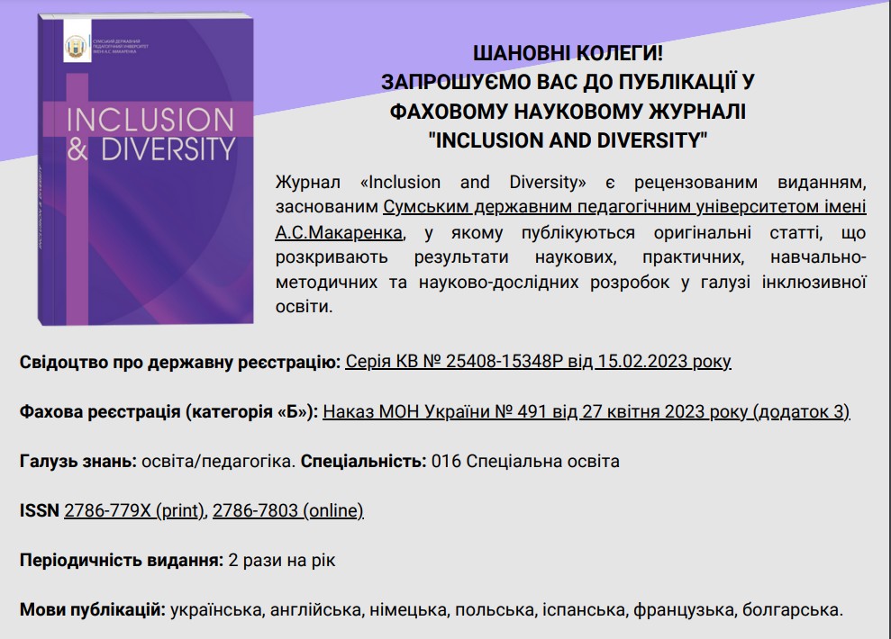 Запрошуємо вас до публікації у фаховому науковому журналі «Inclusion and Diversity»