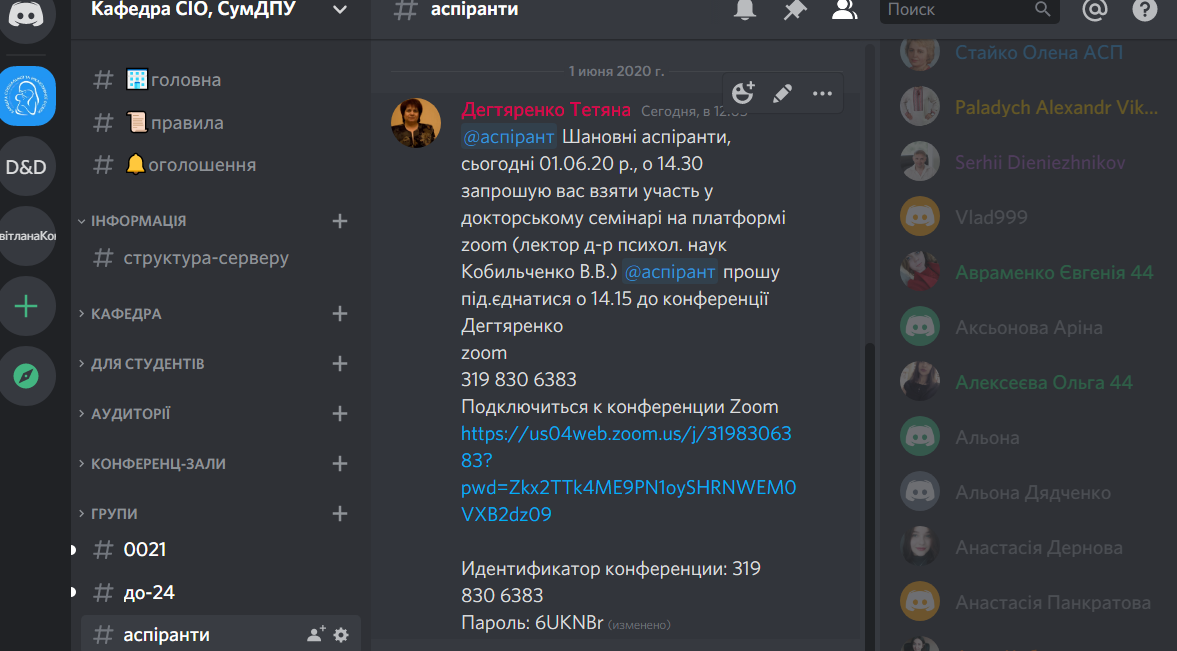 01 червня 2020 року стейкхолдери з м. Київ Кобильченко Вадим Володимирович та Омельченко Ірина Миколаївна брали участь у проведенні Докторського семінару з теоретичних та методичних засад педагогічних досліджень у галузі спеціальної освіти, який проводила лектор – доктор педагогічних наук, професор Дегтяренко Тетяна Миколаївна.