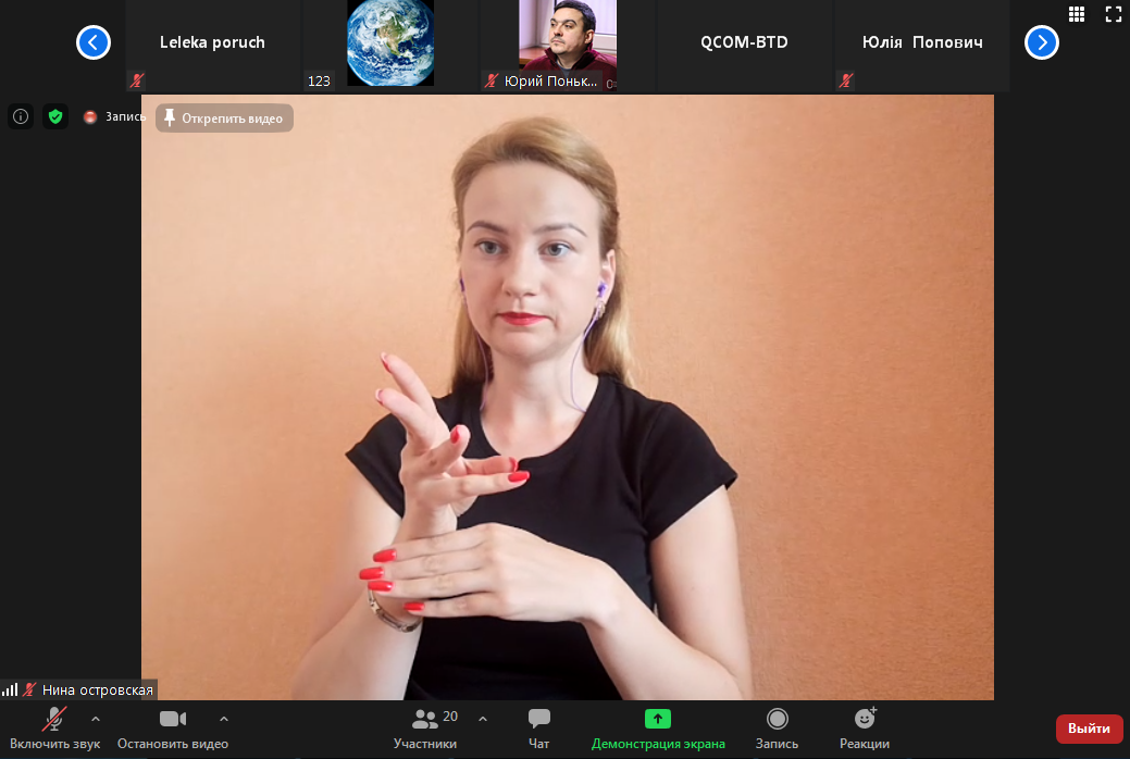 Від кафедри спеціальної та інклюзивної освіти СумДПУ імені А.С. Макаренка була залучена до заходу перекладач – Островська Ніна Олегівна, яка забезпечила переклад жестовою мовою виступів учасників. Вона інформувала присутніх як зробити будь-який захід доступним для людини з порушеннями слуху, де можна знайти перекладача жестової мови, а також запросила бажаючих опанувати українську жестову мову на курси жестової мови, що проводяться кафедрою на базі СумДПУ імені А.С. Макаренка.