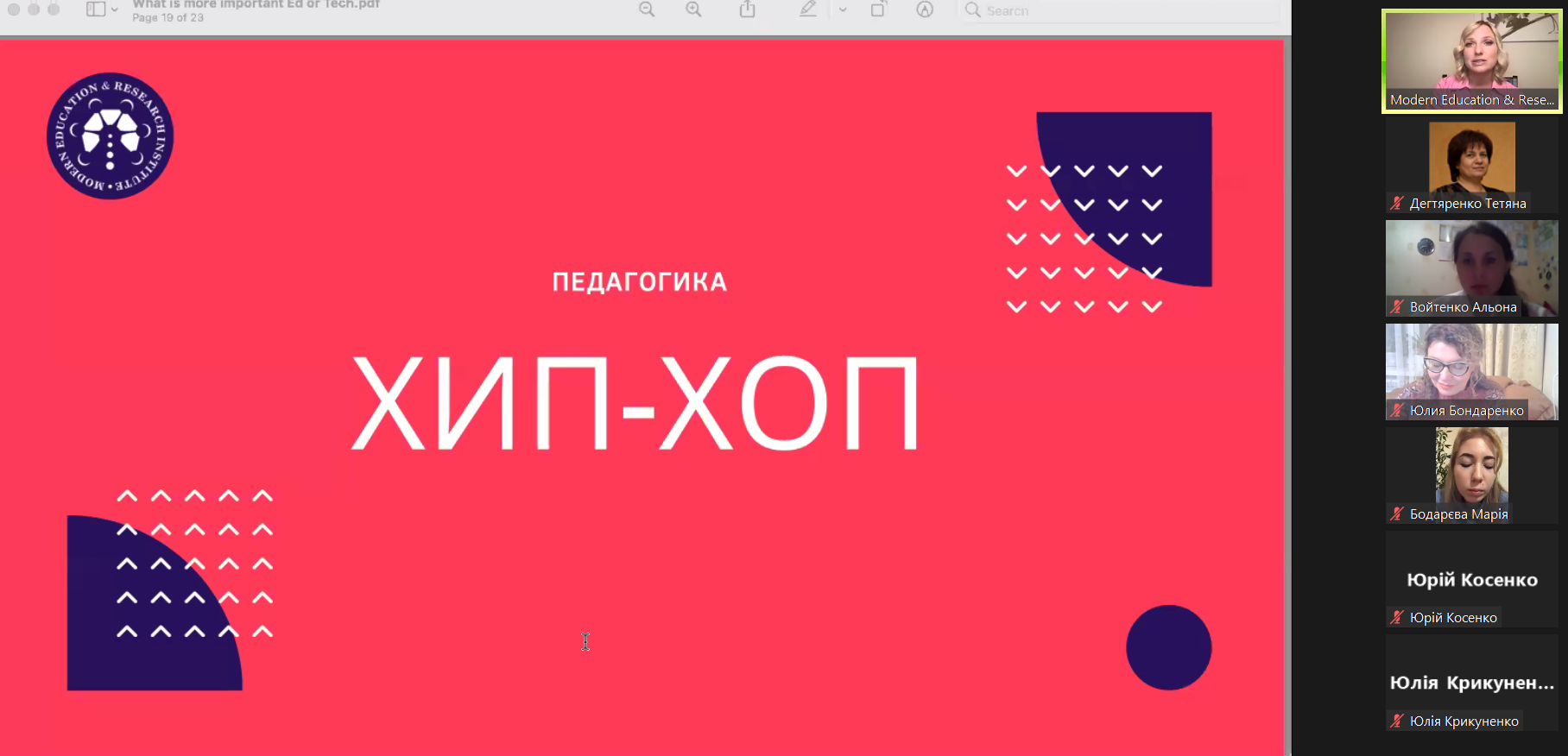 Присутнім аспірантам і гостям Катерина Царанок розкрила декілька важливих технологій, які, на її думку, здатні змінити освіту в глобальному масштабі. Зокрема були розкриті такі педагогічні методи, як «використання збагаченої реальності», «когнітивне поглинання», «метод подяки», «хіп-хоп педагогіка» та інші. Доповідач провела цікаву та емоційну хіп-хоп руханку.