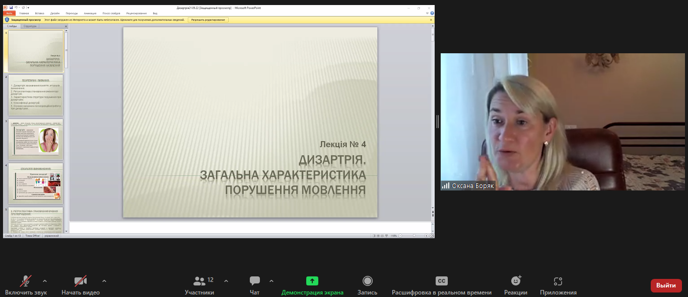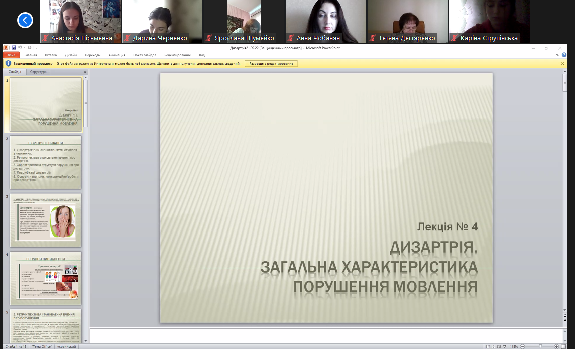Лекторкою було висвітлено ретроспективу становлення вчення про дизартрію, етіологію його виникнення, схарактеризовано структуру порушення, його класифікації, визначено та обґрунтовано основні напрямки логокорекційної роботи.