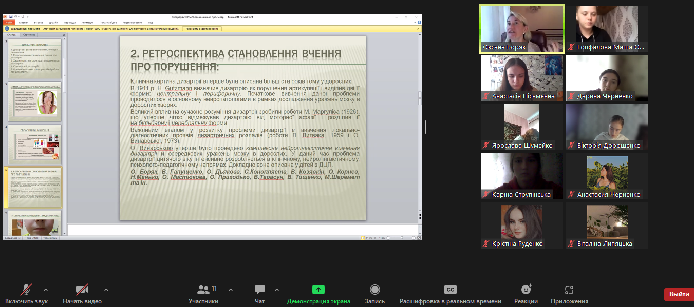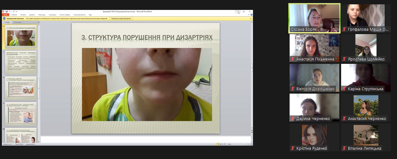 зі студентами IІ курсу спеціальності 016 Спеціальна освіта (016.02 Олігофренопедагогіка) 0021 академічної групи денної форми навчання з освітнього компоненту «Основи логопедії» на тему: «Дизартрія. Загальна характеристика порушення» на платформі Zoom.