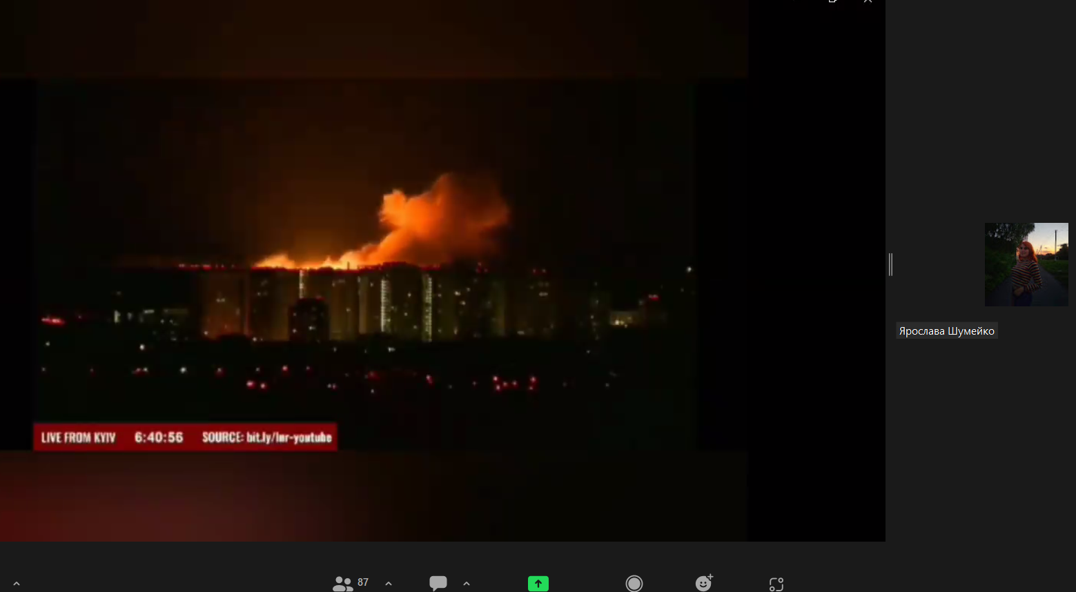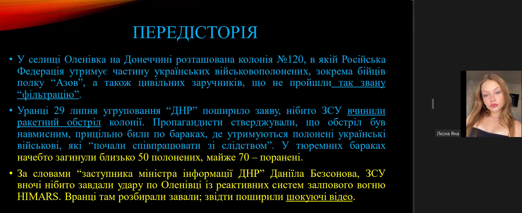 Завідувач кафедри, професор Оксана Боряк розпочала зустріч. Доцент Юрій Косенко розповів про історію протистояння між Україною та рф: про початок військової агресії в 2014 році, висвітлив найбільш важливі події гібридного етапу цього збройного протистояння.