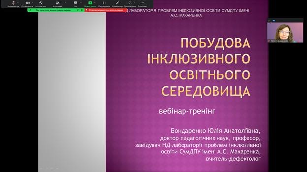 25 лютого 2023 року, у межах діяльності науково-дослідної лабораторії проблем інклюзивної освіти кафедри спеціальної та інклюзивної освіти СумДПУ імені А.С. Макаренка відбувся вебінар-тренінг «Побудова інклюзивного освітнього середовища».