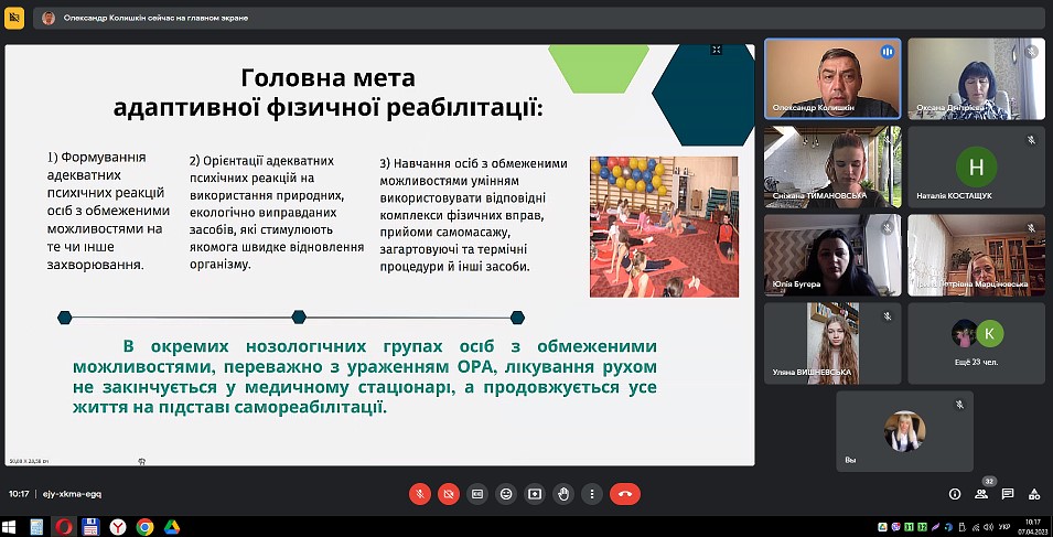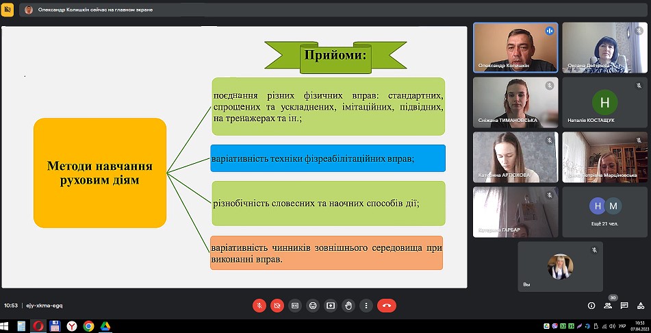 Під час зустрічі розглянуто наступні питання: 1. Специфічні завдання адаптивної фізичної реабілітації дітей з порушеннями психофізичного розвитку. 2. Форми проведення занять з адаптивної фізичної реабілітації для дітей різних нозологічних груп. 3. Засоби адаптивної фізичної реабілітації. 4. Методика застосування засобів адаптивної фізичної реабілітації.