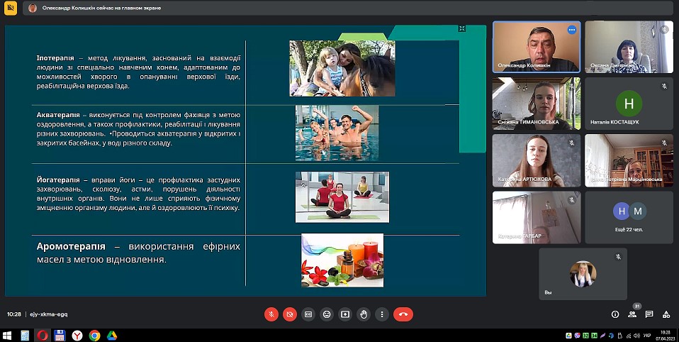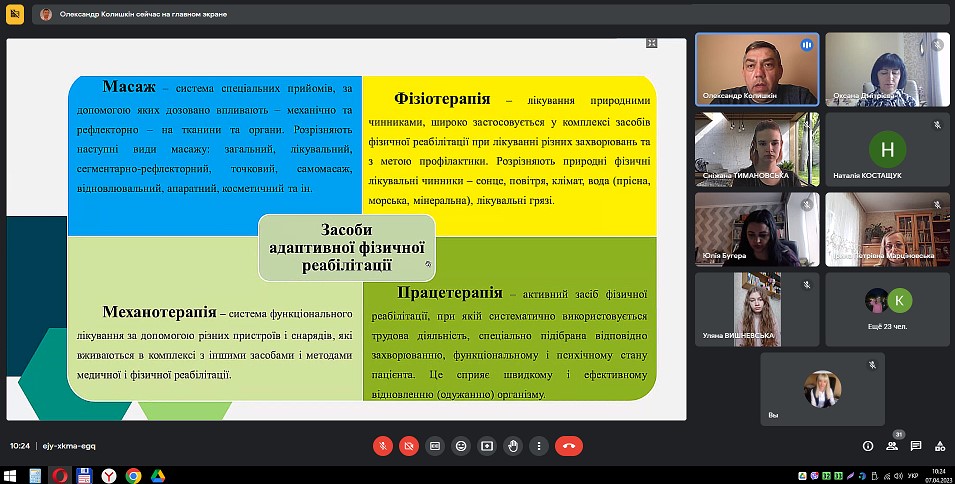 Значну увагу під час викладання лекційного матеріалу було приділено визначенню засобів адаптивної фізичної реабілітації та розкриттю методики їх застосування. Домінуючим в адаптивній фізичній реабілітації визначено корекційно-розвивальний та оздоровчий напрями. Наприкінці зустрічі зі здобувачами освіти було обговорено сучасні тенденції розвитку процесу адаптивної фізичної реабілітації, наголошено на необхідності пошуку і розширення як традиційних, так й інноваційних засобів розглянутого процесу.