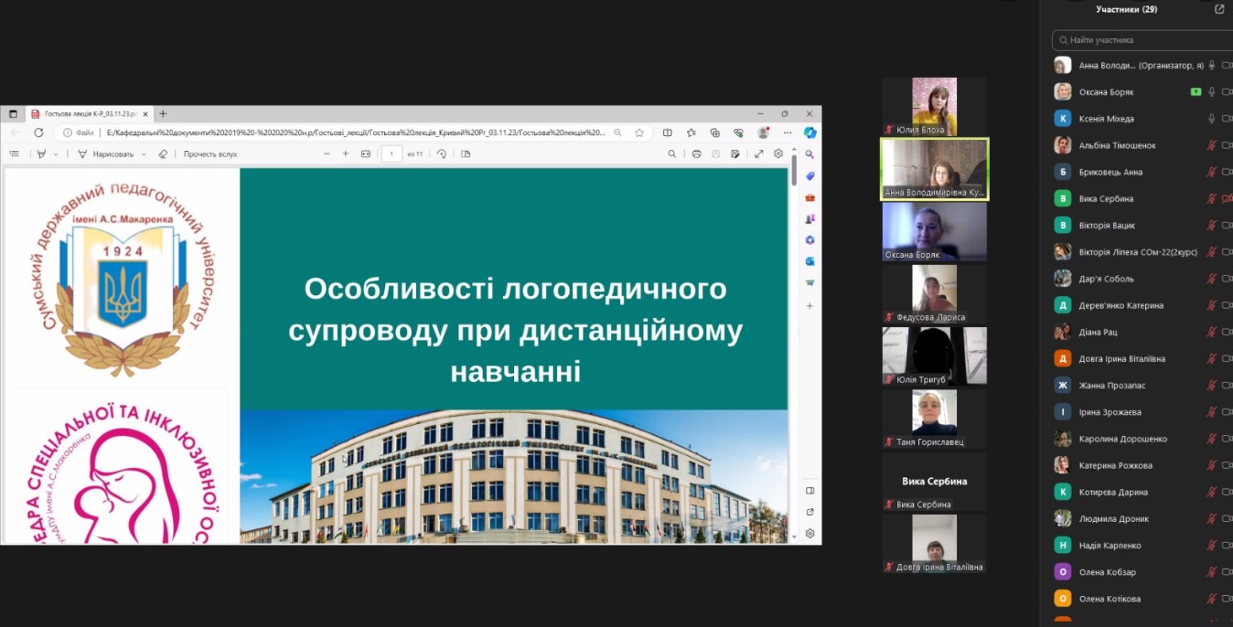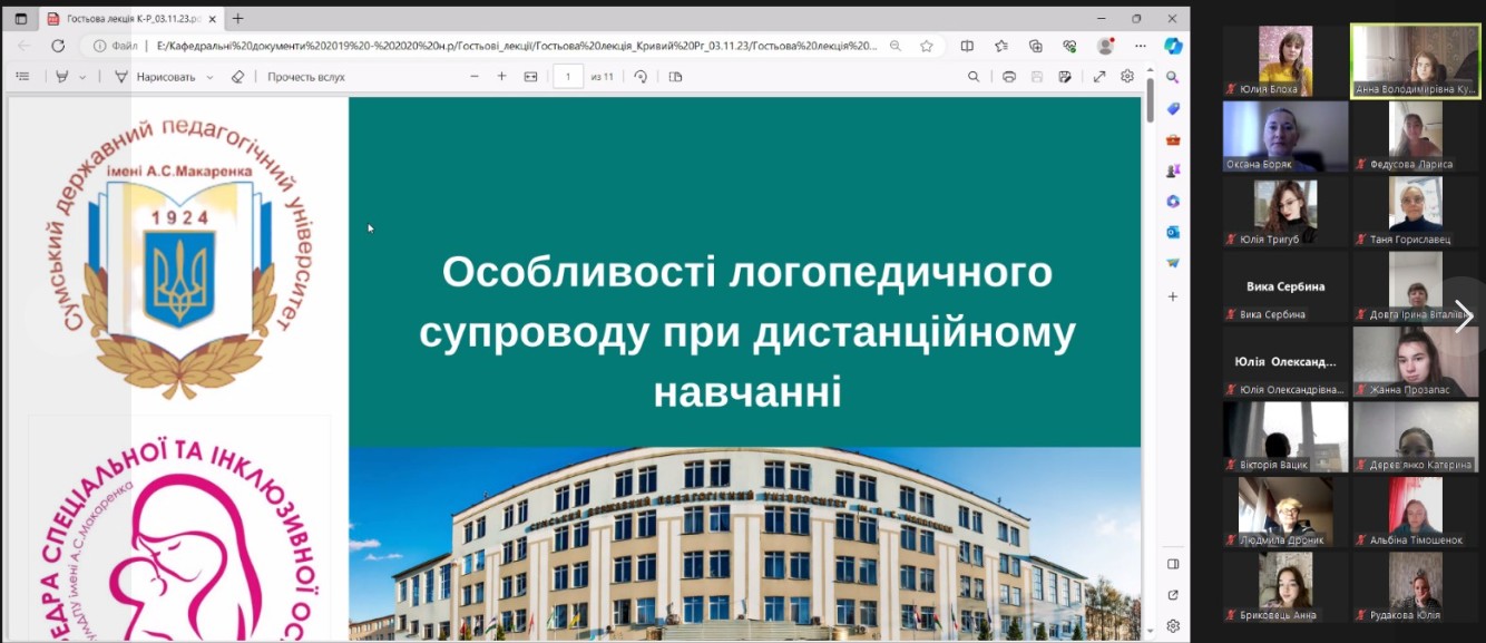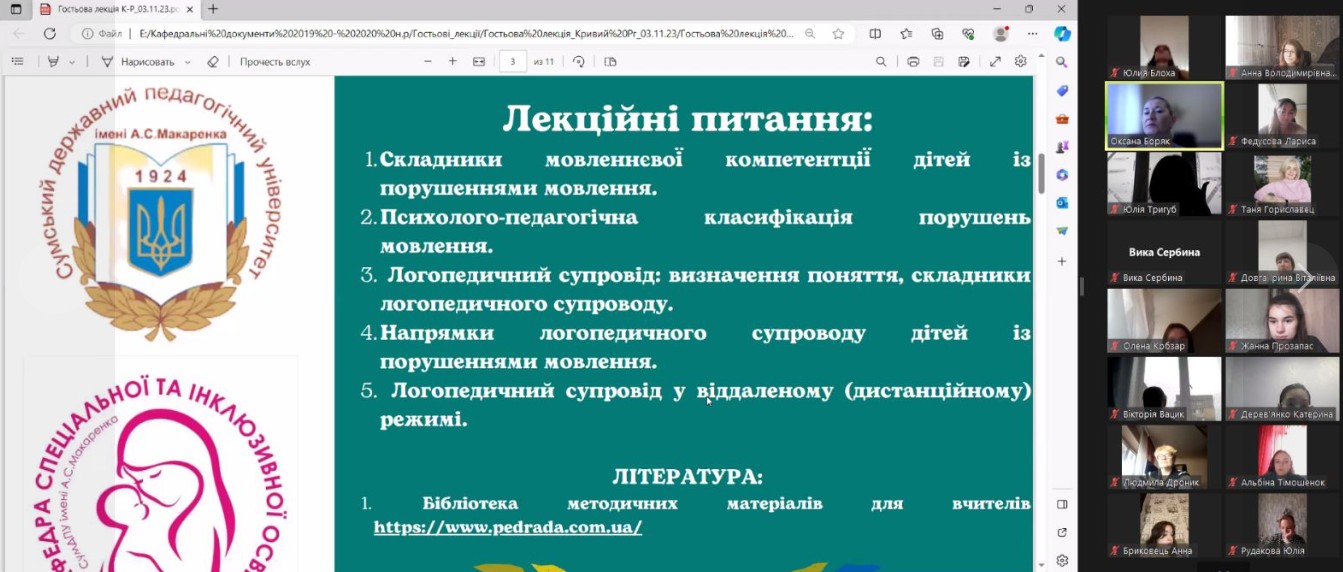 03 листопада 2023 року на запрошення колег з кафедри дошкільної освіти Криворізького державного педагогічного університету, у межах ОК «Методичні засади інноваційної діяльності логопеда в закладах освіти з інклюзивним навчанням» завідувачем кафедри спеціальної та інклюзивної освіти проф. Оксаною Володимирівною БОРЯК було проведено гостьову лекцію