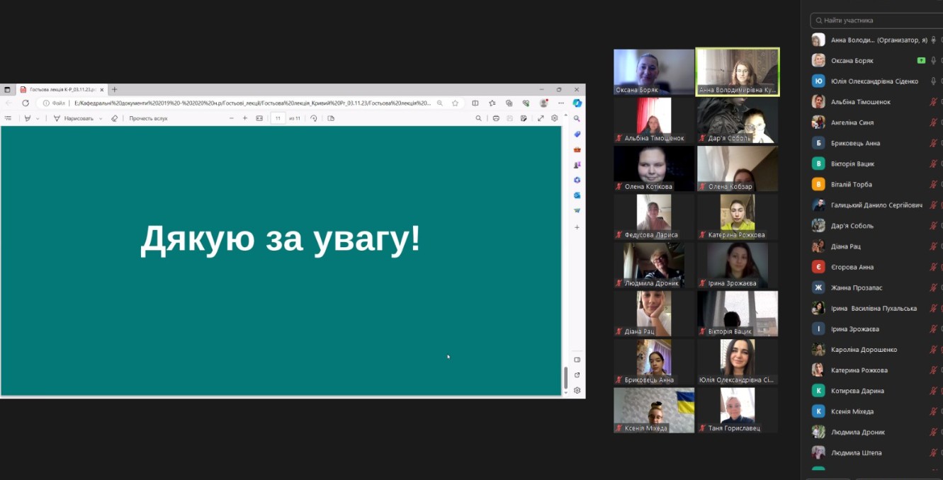 Лектор дякує колегам за запрошення, вдячним здобувачам за активність під час викладу лекційного матеріалу.