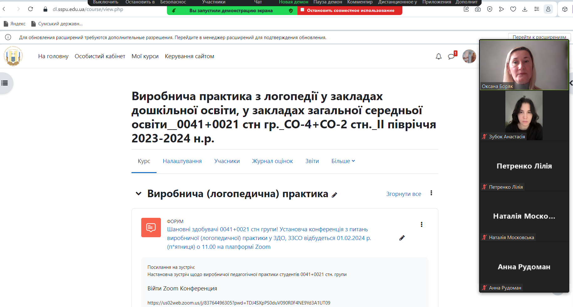які здобувають освіту за ОПП Спеціальна освіта (Олігофренопедагогіка. Логопедія) проведено настановчу конференцію з педагогічної виробничої практики з логопедії в закладах дошкільної освіти, закладах загальної середньої освіти. Завідувач-професор кафедри Оксана БОРЯК ознайомила здобувачів з термінами, базами проходження виробничої практики з логопедії; переліком звітньої документації, вимогами та функціональними обов’язками здобувачів-практикантів.