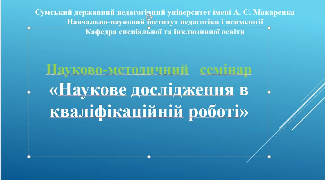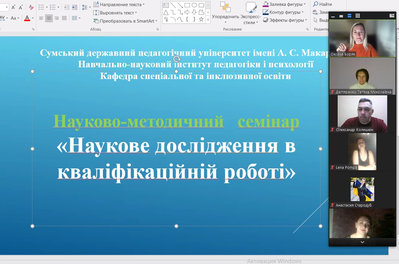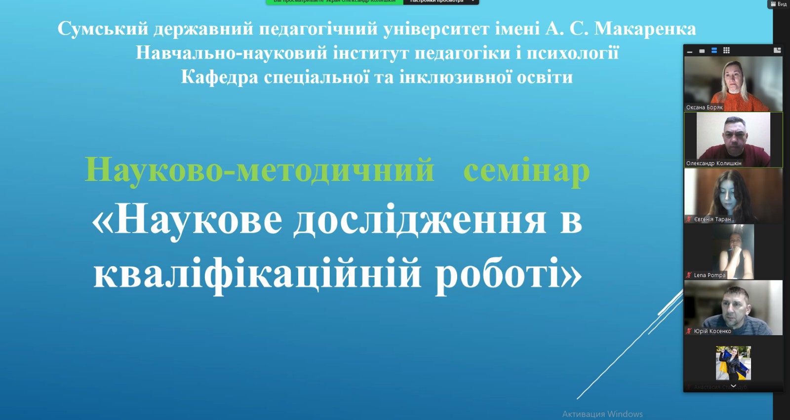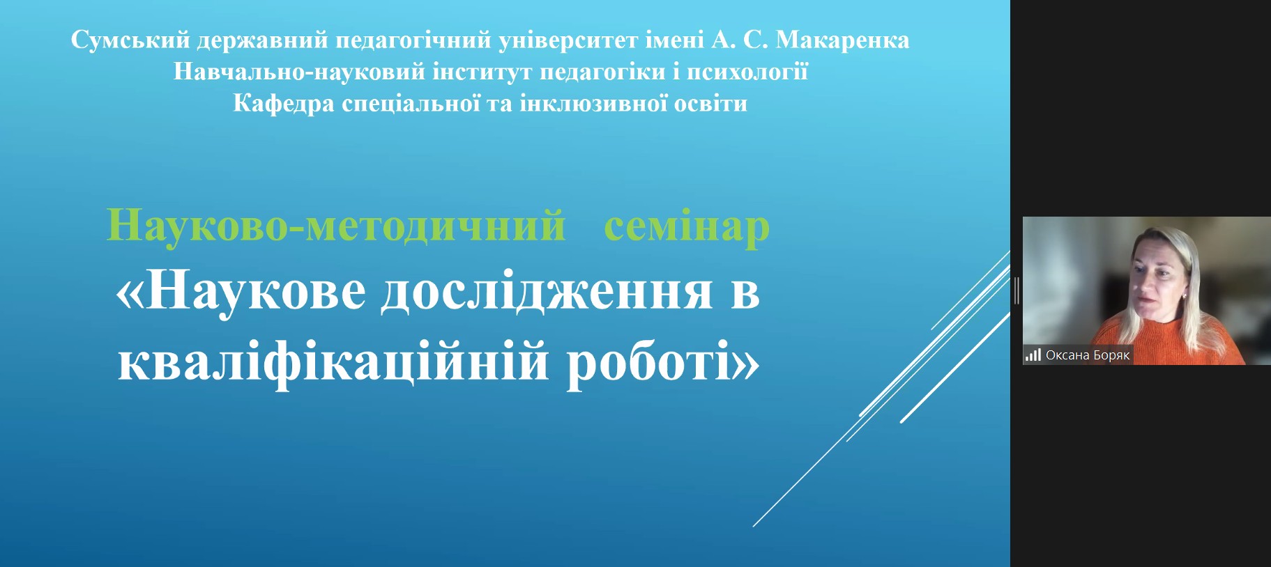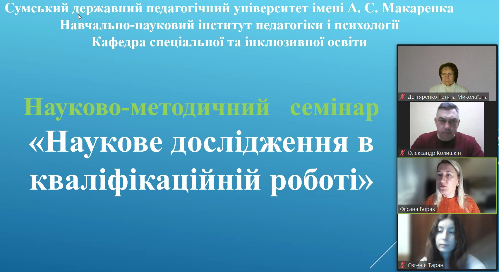 15 лютого 2024 р. професорсько-викладацьким складом кафедри – професором Тетяною ДЕГТЯРЕНКО, доцентом Олександром КОЛИШКІНИМ був організований та проведений науково-методичний семінар «Наукові дослідження в кваліфікаційних роботах» для магістрантів спеціальності 016 Спеціальна освіта денної і заочної форм навчання.