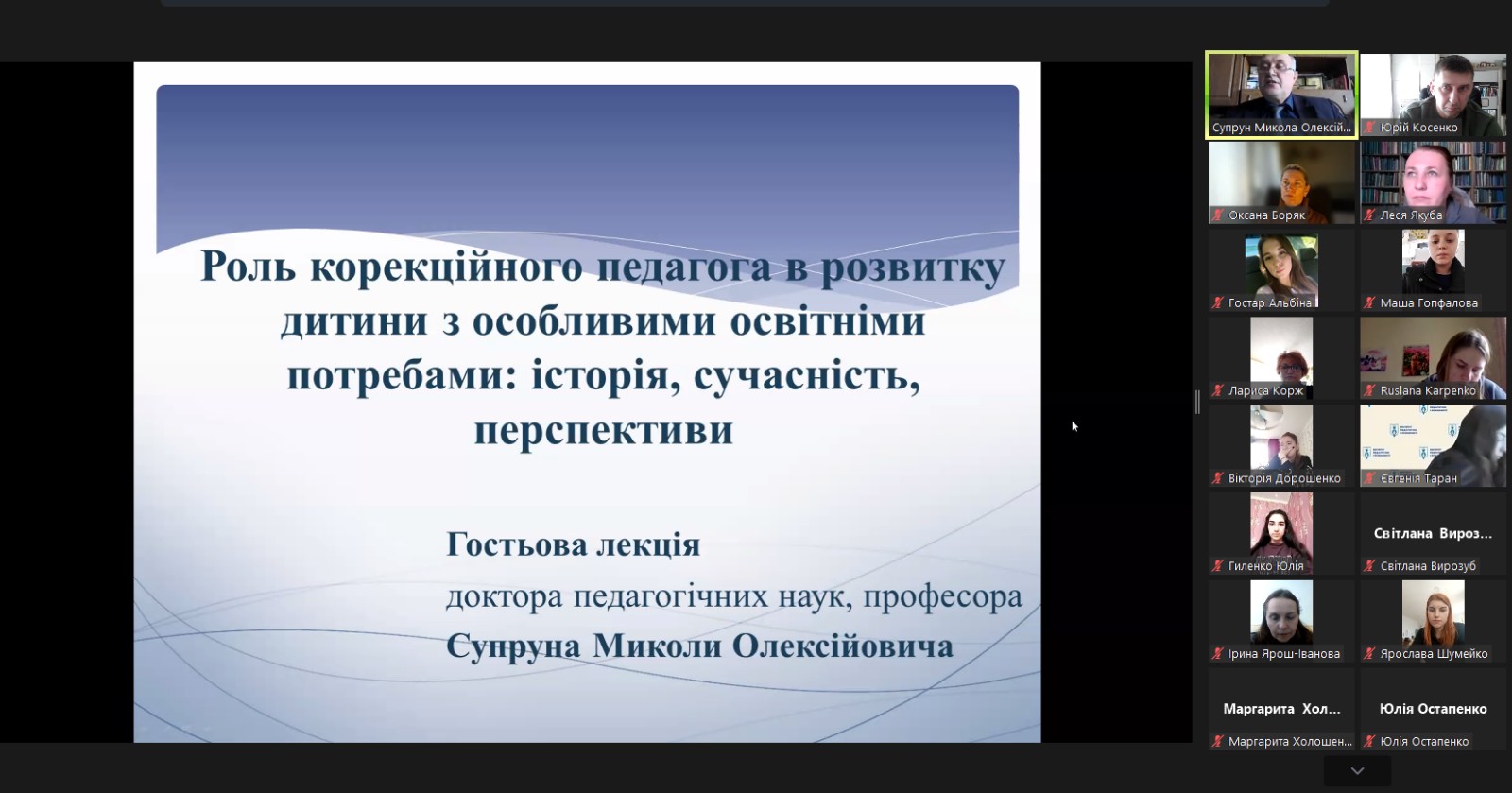 28 березня 2024 року для здобувачів другого (магістерського) рівня вищої освіти спеціальності 016 Спеціальна освіта у межах освітнього компоненту «Спеціальні предметні методики та педагогічні технології навчання та виховання дітей з порушеннями інтелектуального розвитку» доктором педагогічних наук, професором Миколаївського національного університету імені В. О. Сухомлинського Миколою СУПРУНОМ було проведено гостьову лекцію на тему «Роль корекційного педагога в розвитку дитини з особливими освітніми потребами: історія, сучасність, перспективи».