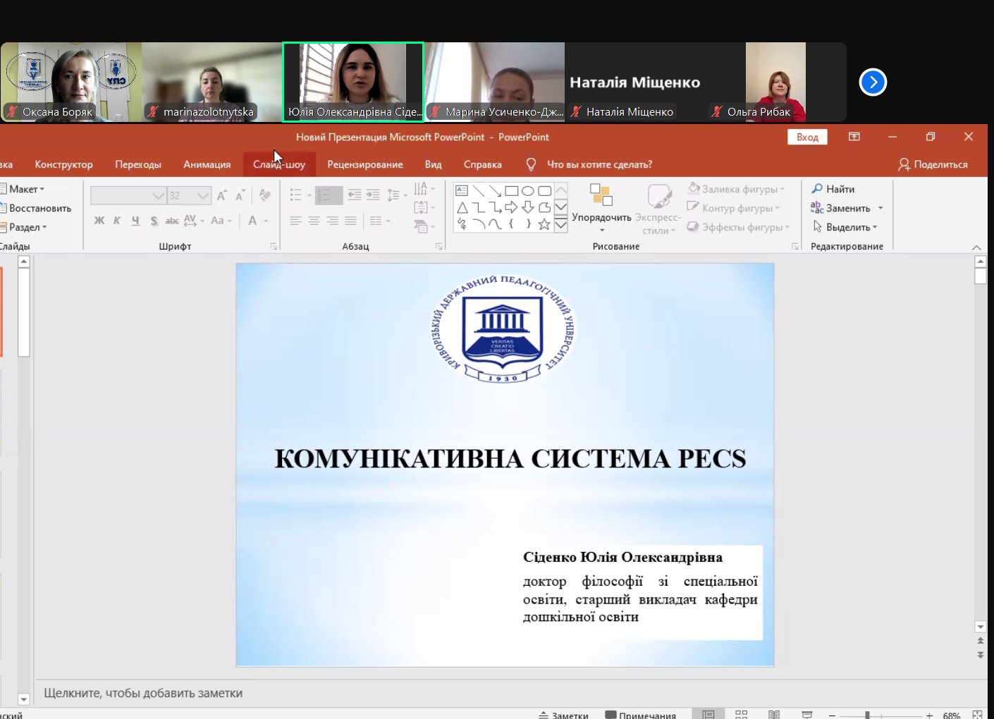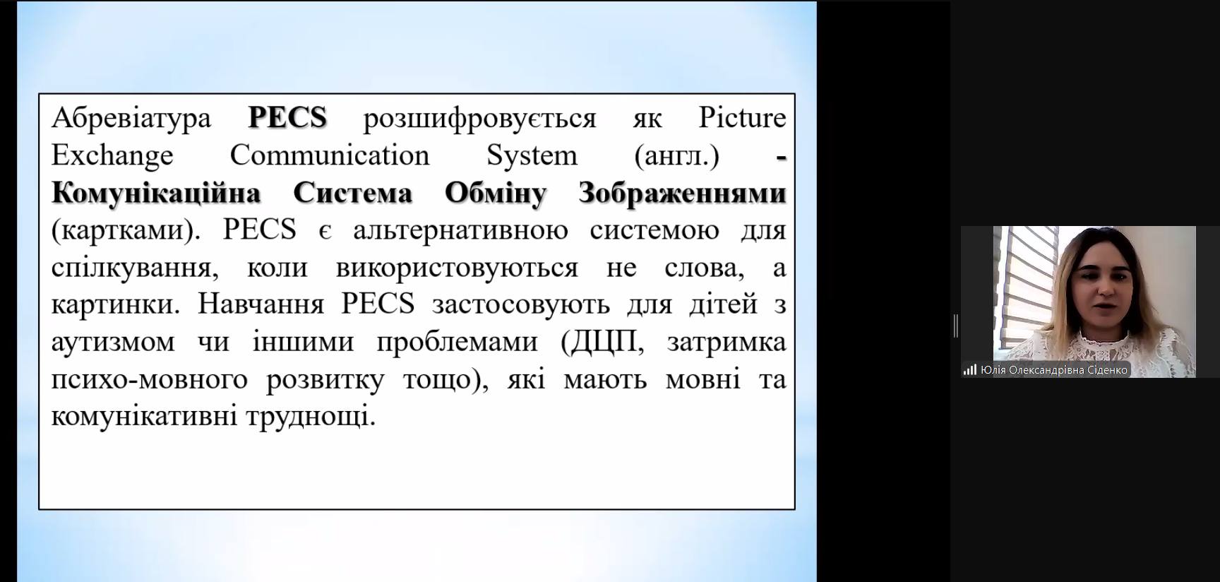 для здобувачів ОС «Магістр», спеціальності 016 Спеціальна освіта (016.02 Корекційна психопедагогіка», ОПП Спеціальна освіта «Корекційна психопедагогіка. Логопедія» першого року навчання, відбулася гостьова лекція доктора філософії, старшого викладача кафедри дошкільної та спеціальної освіти Криворізького державного педагогічного університету, практикуючого дефектолога – Юлії Олександрівни Сіденко, на тему «Комунікативна система PECS».