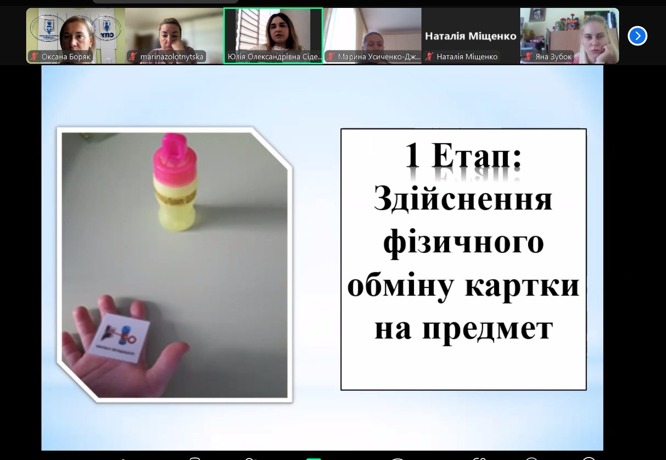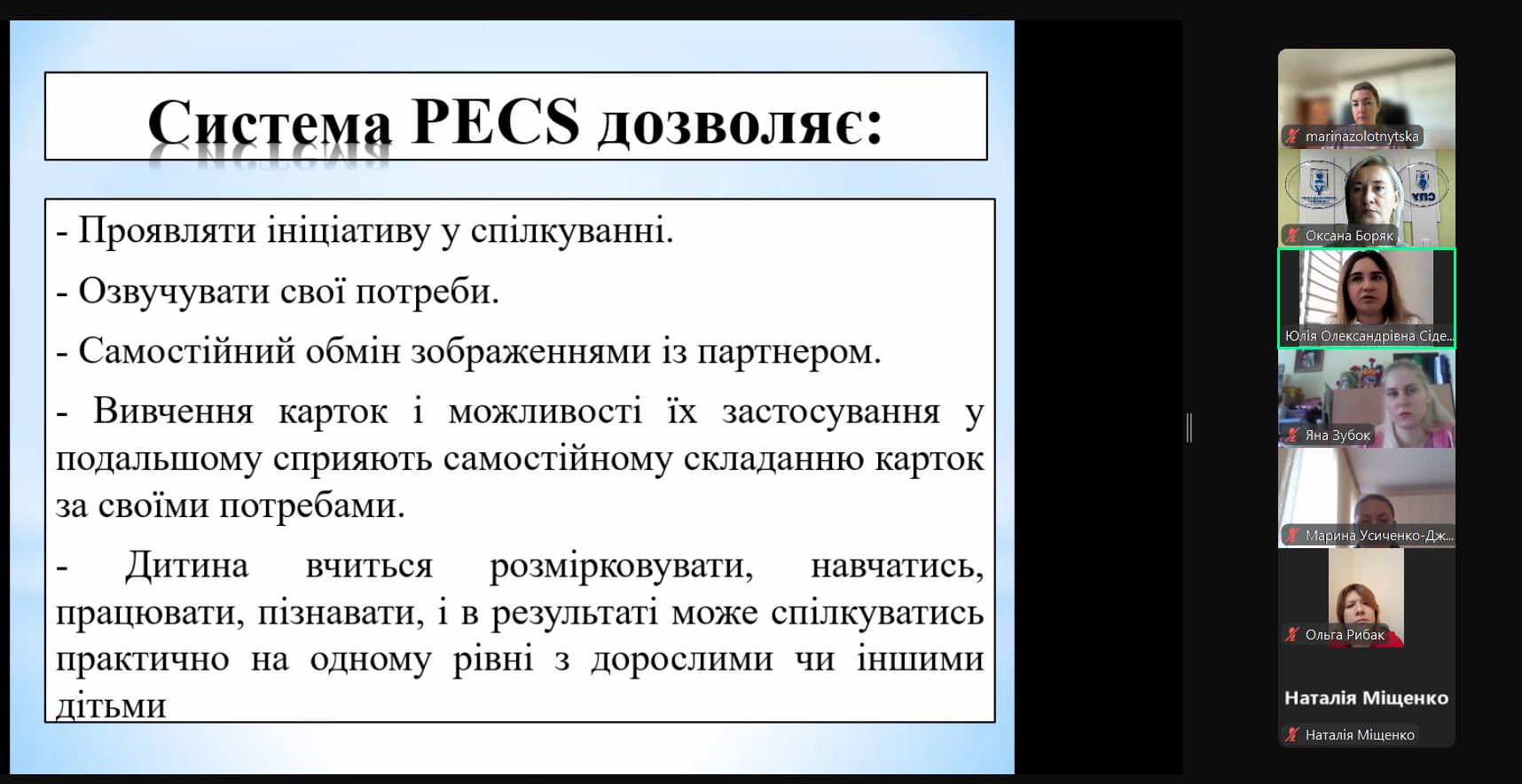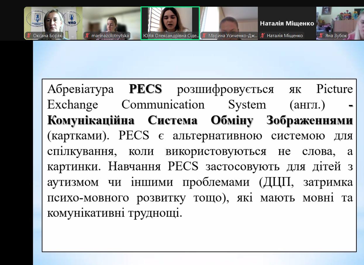 Під час лекції пані Юлія висвітлила питання історії створення комунікативної системи; докладно зупинилася на етапах впровадження комунікативних карток в роботі з безмовленнєвими дітьми, зокрема – дітьми з РАС.