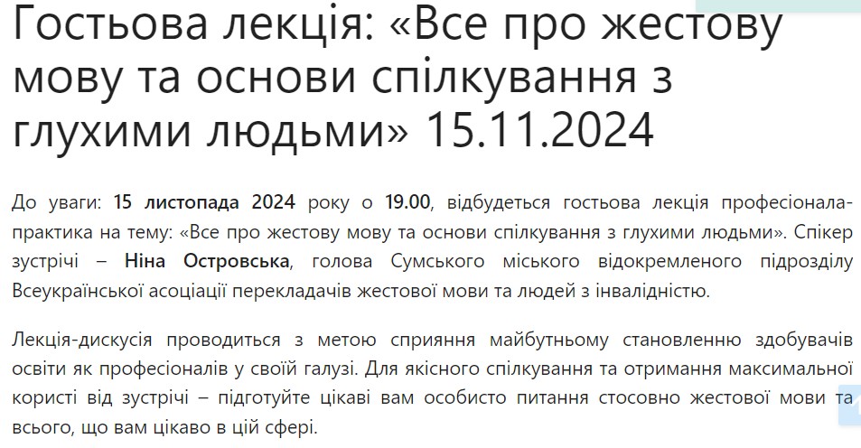 15 листопада 2024 року відбулася гостьова лекція професіонала-практика на тему: «Все про жестову мову та основи спілкування з глухими людьми». Спікер зустрічі – Ніна ОСТРОВСЬКА,
