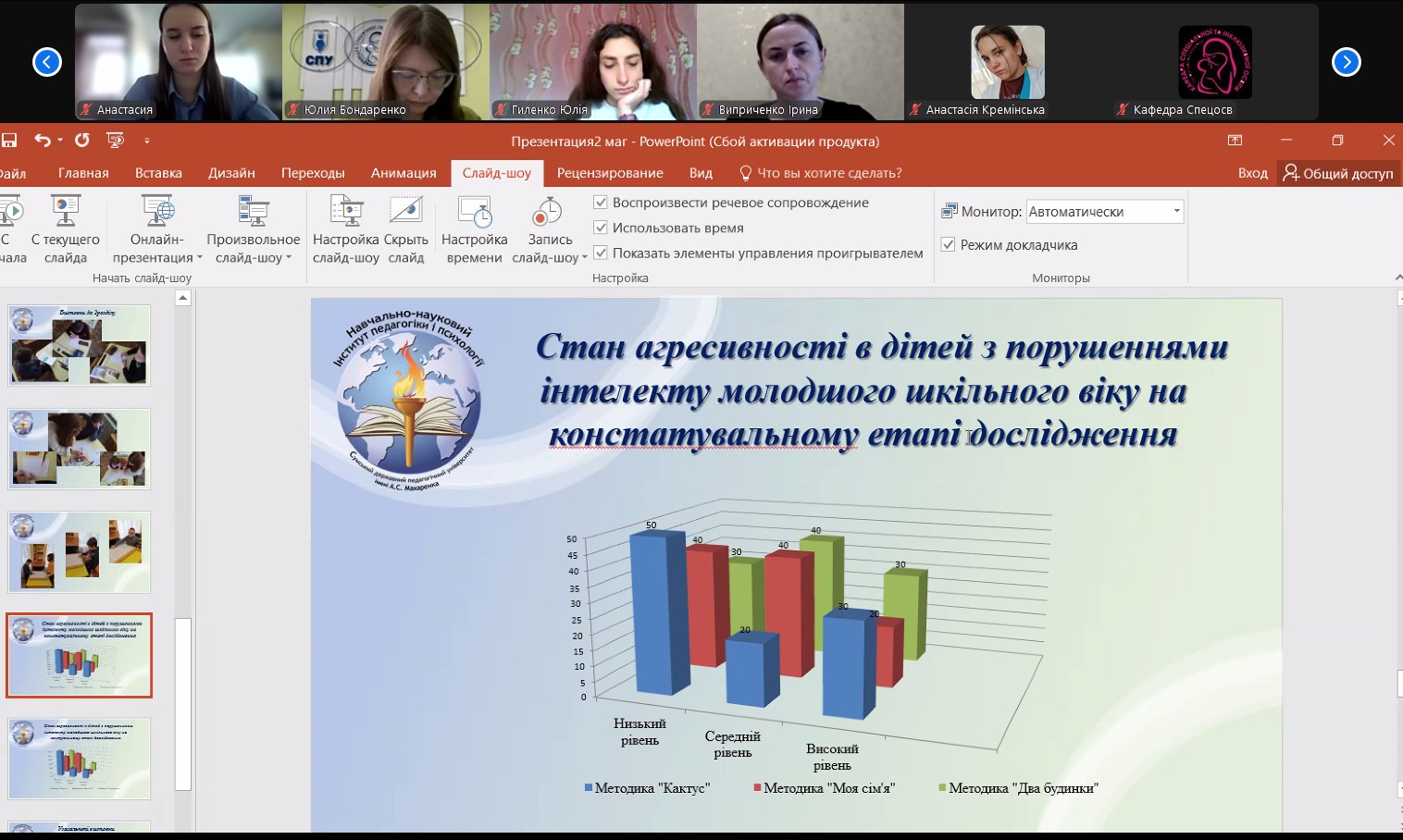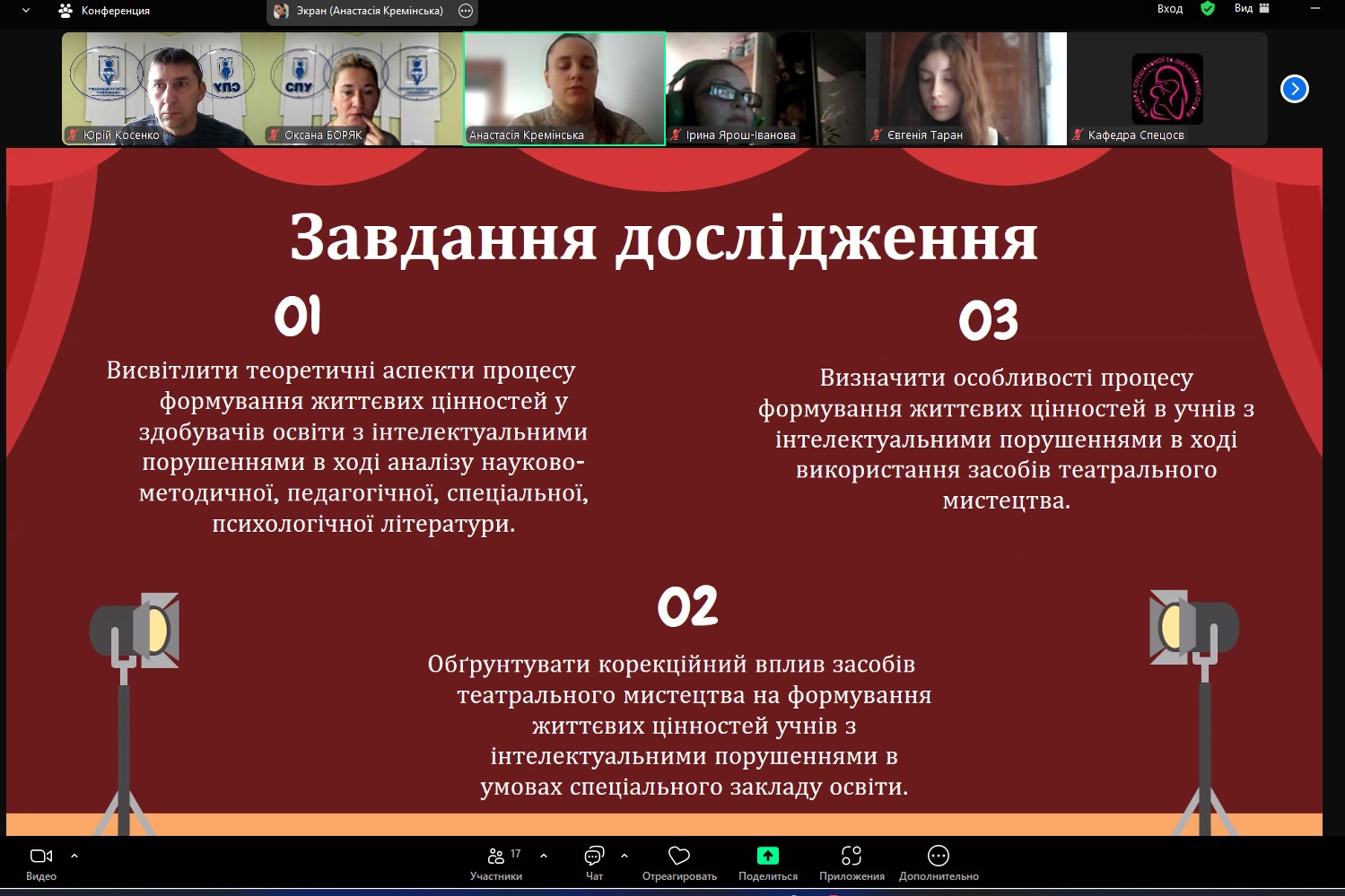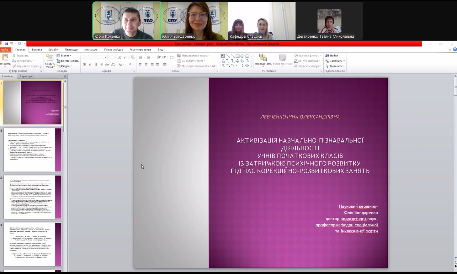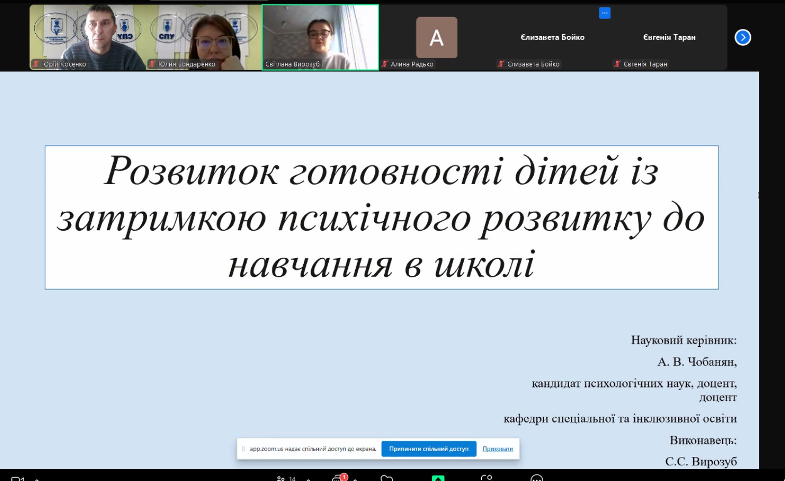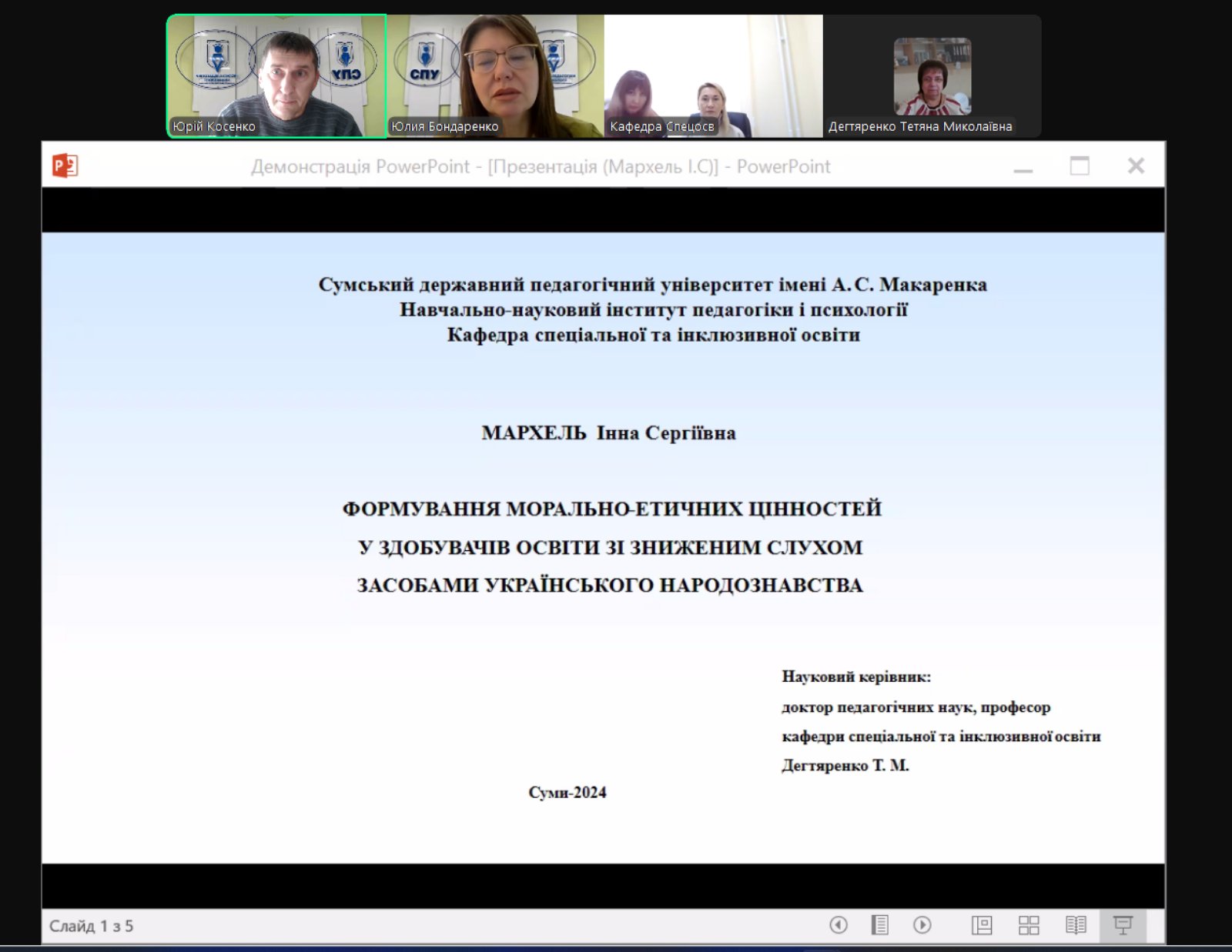 25 листопада 2024 року в он-лайн форматі на розширеному засіданні кафедри спеціальної та інклюзивної освіти відбувся попередній захист кваліфікаційних робіт здобувачів вищої освіти другого (магістерського) рівня спеціальності 016 Спеціальна освіта (016.02 Олігофренопедагогіка),( 016.05 Тифлопедагогіка), які здобували освіту за ОПП Спеціальна освіта (Олігофренопедагогіка. Логопедія), ОПП Спеціальна освіта (Тифлопедагогіка. Сурдопедагогіка) денної та заочної форм навчання.