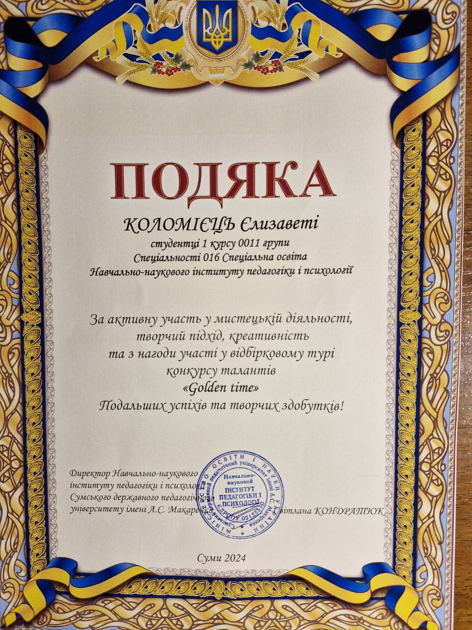 За активну участь у мистецькій діяльності, творчий підхід, креативність та з нагоди участі у відбірковому турі конкурсу талантів «Golden tame» нагороджено студентів ННІПП, серед них здобувачі вищої освіти 0011 групи: Вишневська Софія, Сушко Яна, Коломієць Єлизавета.