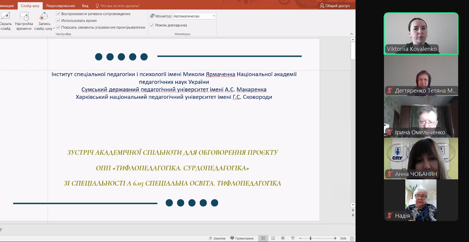 На запрошення д.пед.н., завідувача кафедри спеціальної педагогіки Харківського національного педагогічного університету імені Г.С. Сковороди В. Коваленко проведено зустріч академічної спільноти відділу освіти дітей з порушеннями сенсорного розвитку Інституту спеціальної педагогіки і психології імені М. Ярмаченка НАПН України та кафедри спеціальної та інклюзивної освіти Сумського державного педагогічного університету імені А.С. Макаренка для обговорення проєкту ОПП «Тифлопедагогіка. Сурдопедагогіка» підготовки фахівців другого (магістерського) рівня вищої освіти Сковородинівського університету.