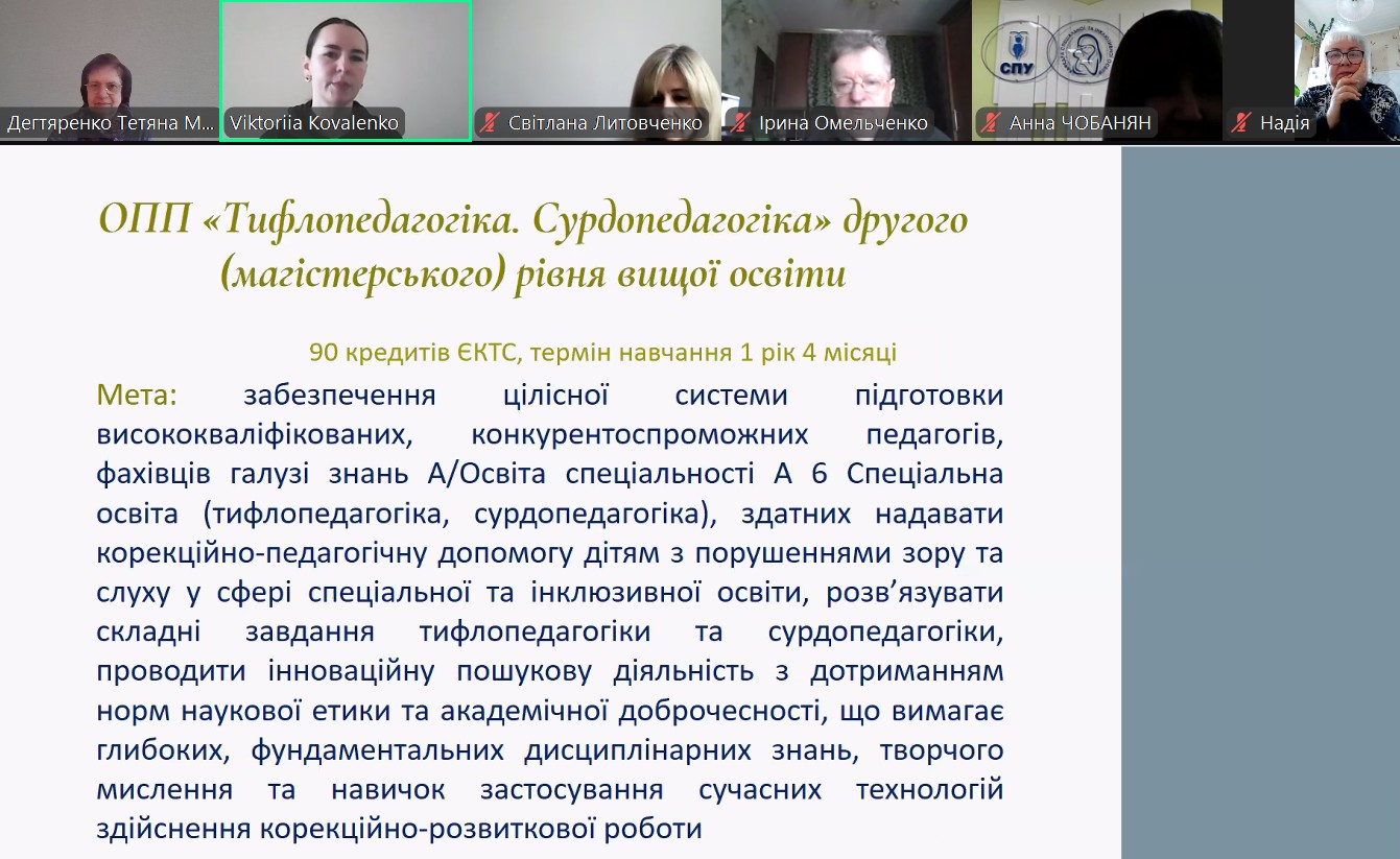 У ході зустрічі д.пед.н., проф. Є. Синьова схарактеризувала актуальні питання удосконалення ОПП «Тифлопедагогіка. Сурдопедагогіка», окреслила сучасні проблеми навчання, виховання, розвитку та соціалізації осіб із сенсорними порушеннями.