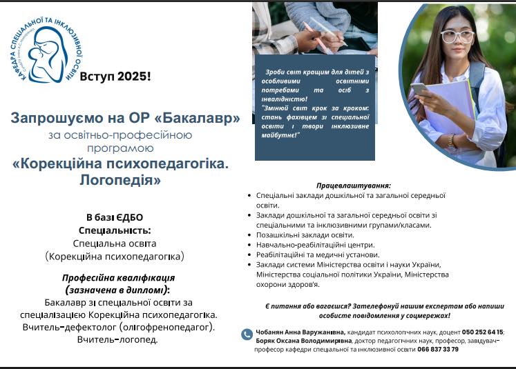 29 березня 2025 року в Навчально-науковому інституті педагогіки і психології відбувся День відкритих дверей, під час заходу кафедра спеціальної та інклюзивної освіти презентувала освітню професійну програму першого (бакалаврського) рівня вищої освіти «Корекційна психопедагогіка. Логопедія».