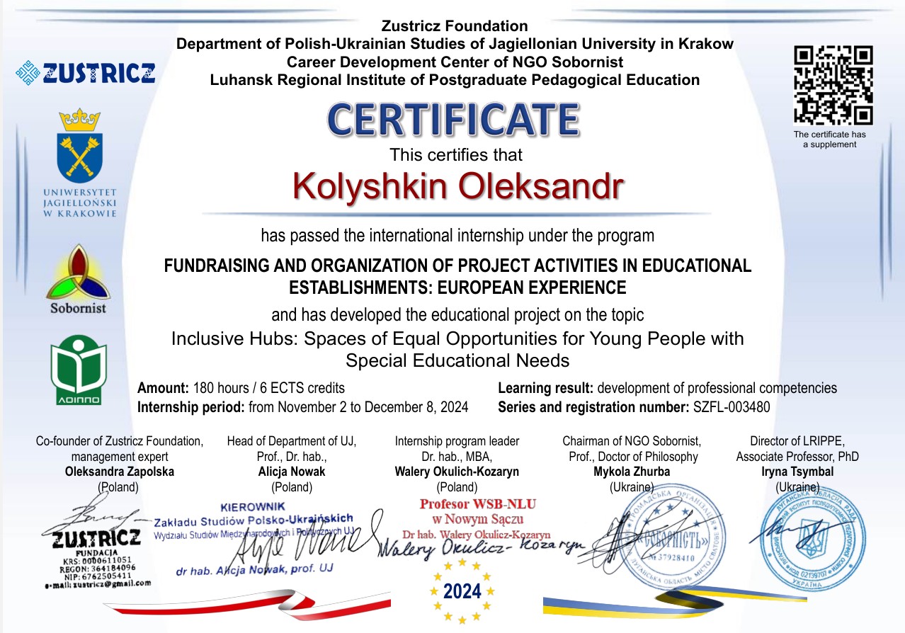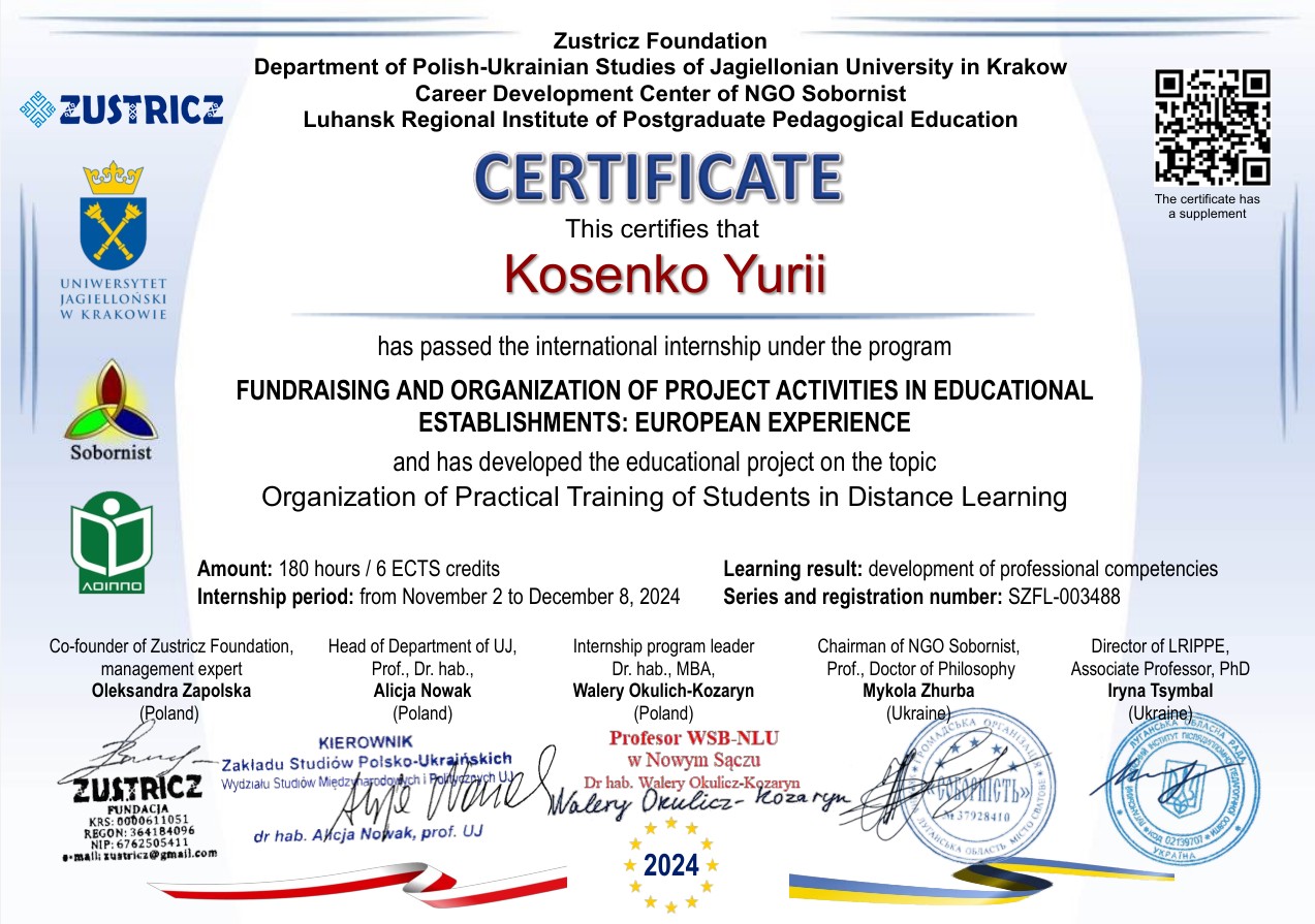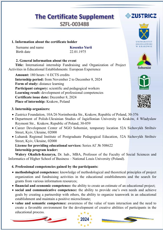 Протягом 02.11.2024 – 08.12.2024 рр. доценти кафедри Олександр КОЛИШКІН і Юрій КОСЕНКО пройшли міжнародне стажування за програмою підвищення кваліфікації «Фандрейзинг та організація проєктної діяльності в закладах освіти: європейський досвід» для педагогічних та науково-педагогічних працівників (Польща – Україна).