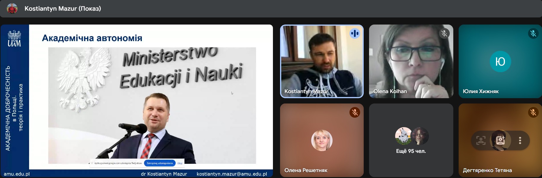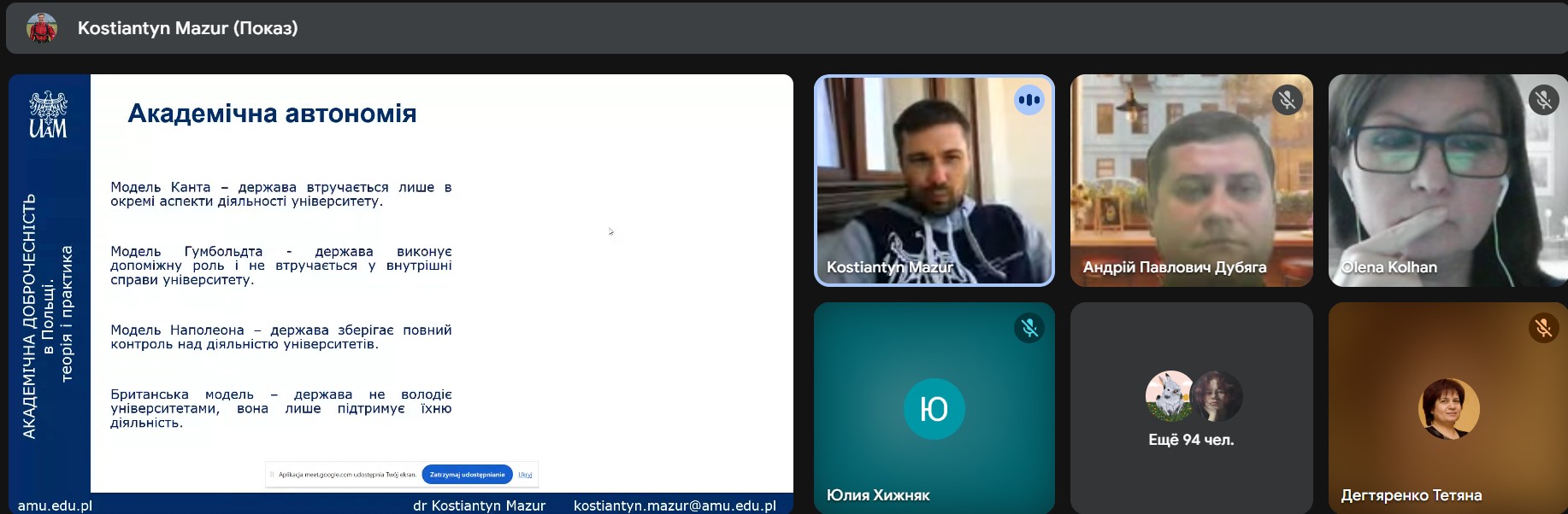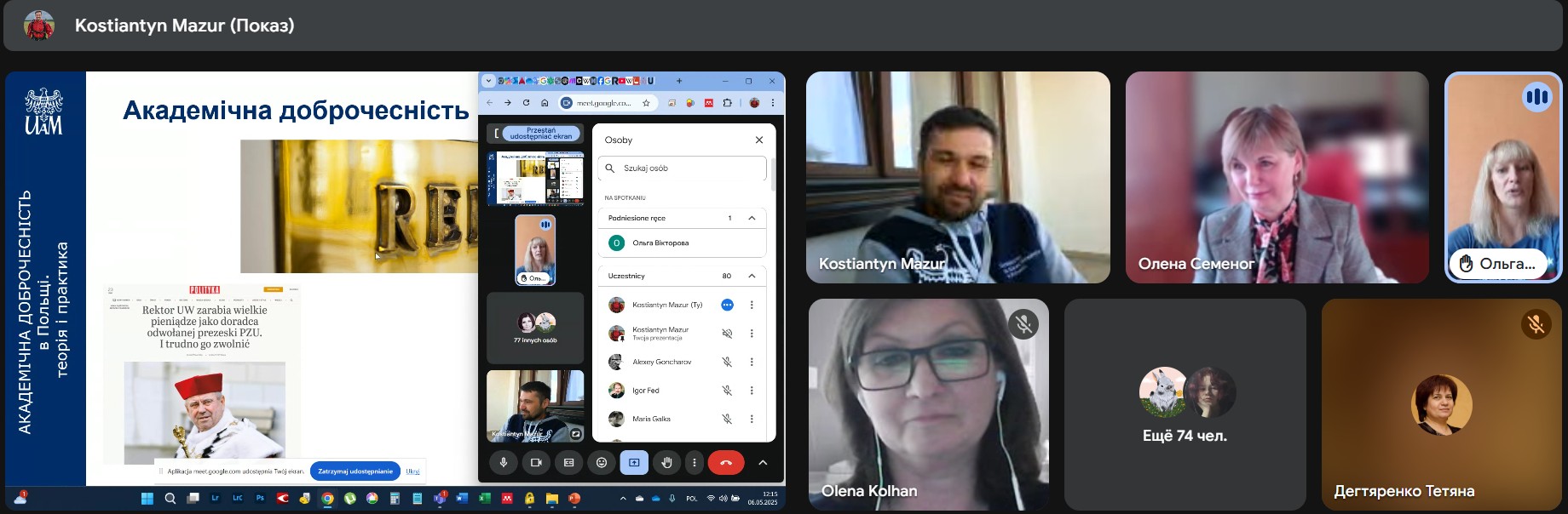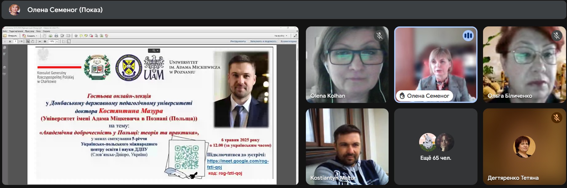 6 травня 2025 року відбулася гостьова лекція д-ра Костянтина Мазура з Університету імені Адама Міцкевича в Познані «Академічна доброчесність у Польщі: теорія та практика». Участь у заході взяли здобувачі вищої освіти та професорсько-викладацький склад кафедри спеціальної та інклюзивної освіти СумДПУ імені А.С. Макаренка.