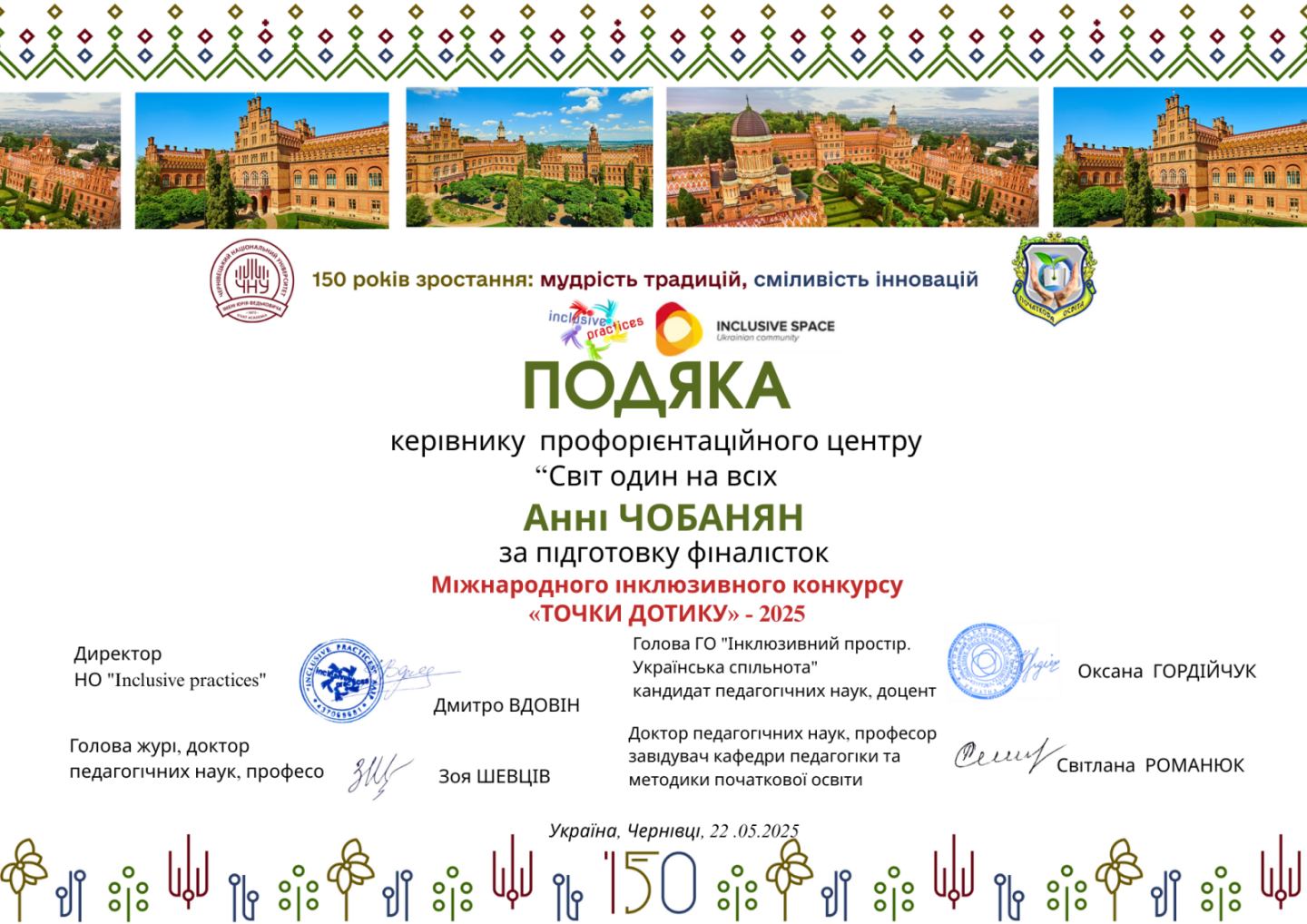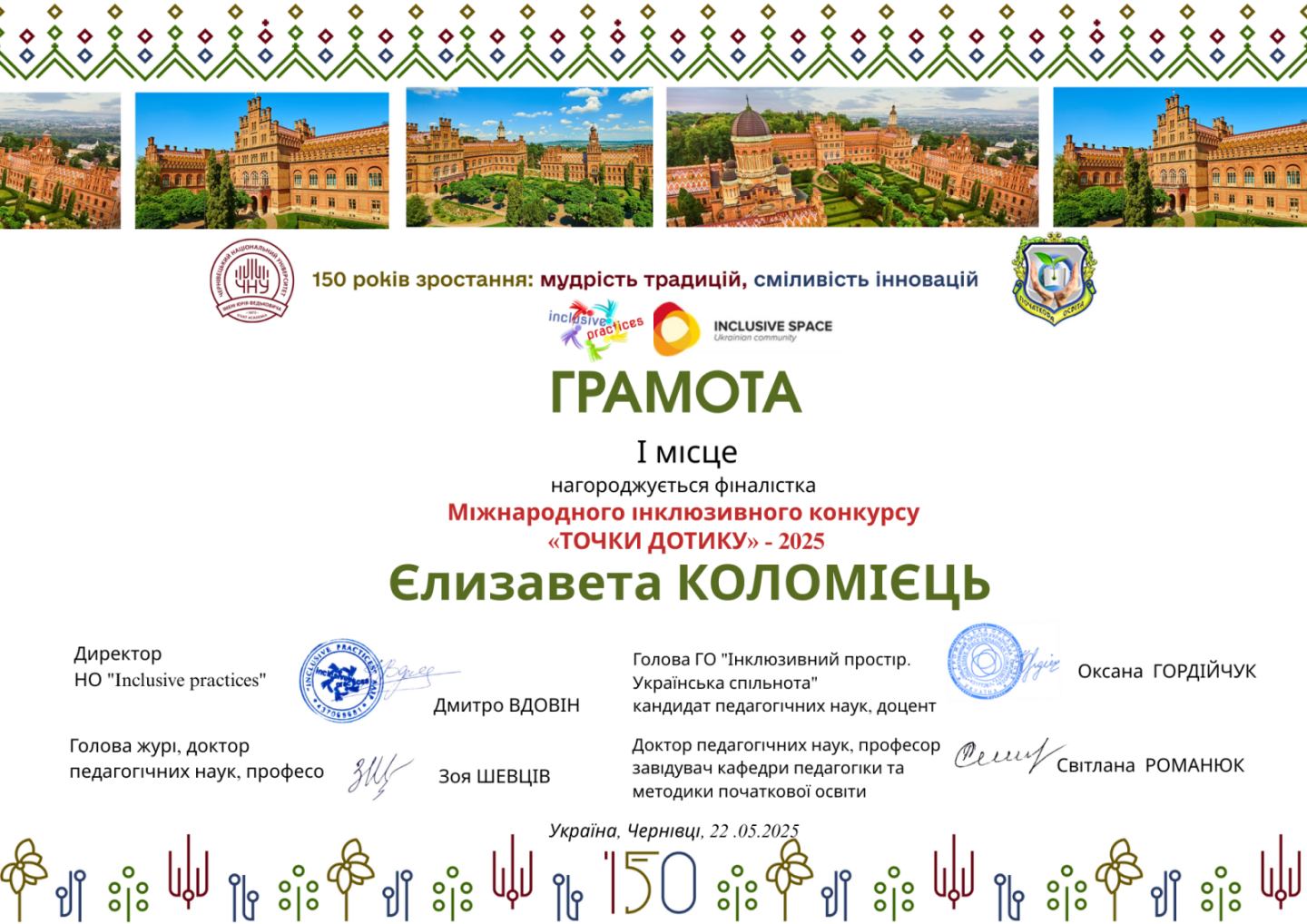 Вітаємо переможців Міжнародного інклюзивного конкурсу «Точки дотику» здобувачів вищої освіти – Єлизавету Киктенко, Єлизавету Коломієць, Серафиму Комісар, Ярославу Шумейко та їх наукового керівника – доцента Анну ЧОБАНЯН, з почесним І МІСЦЕМ!!!