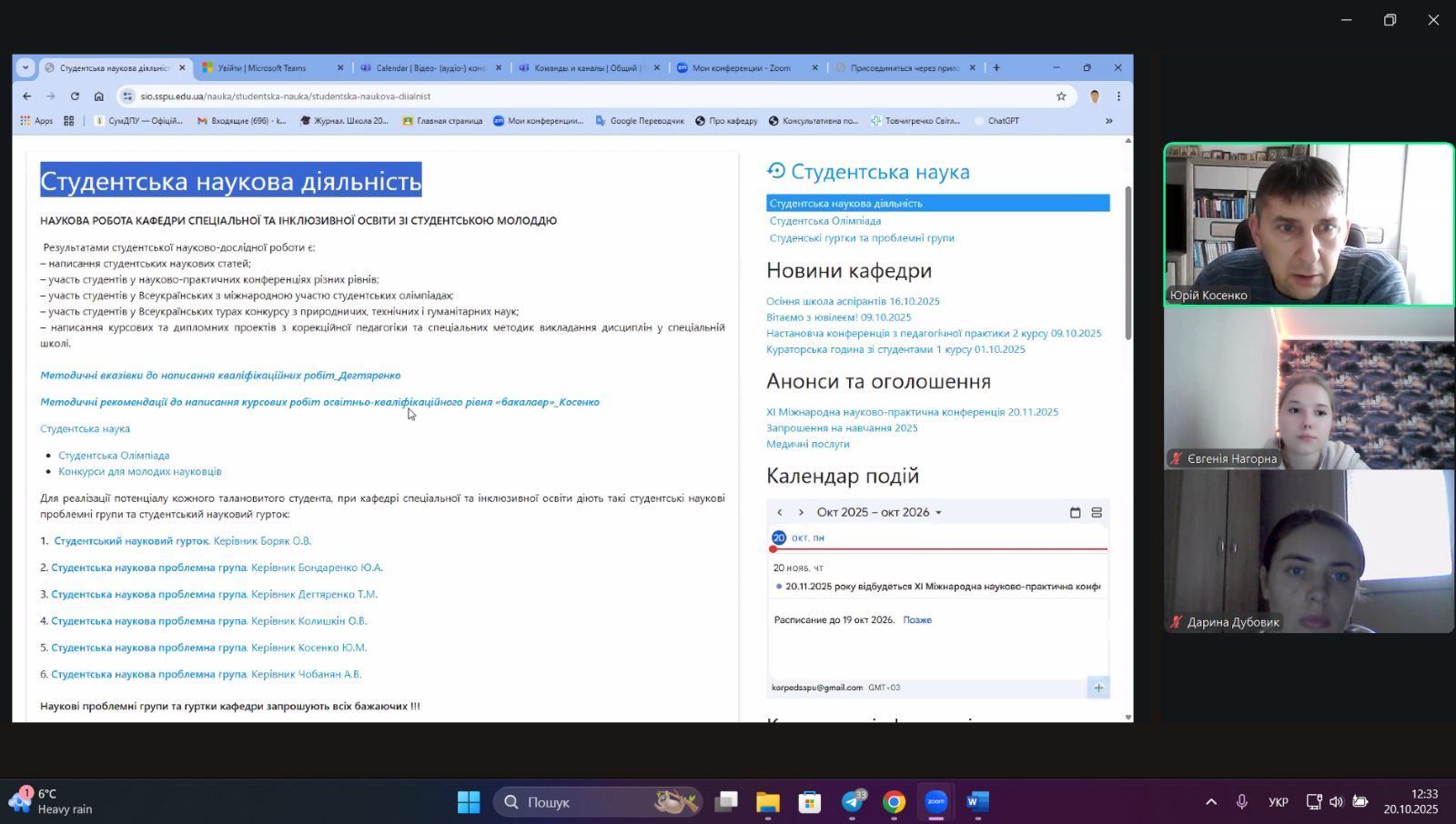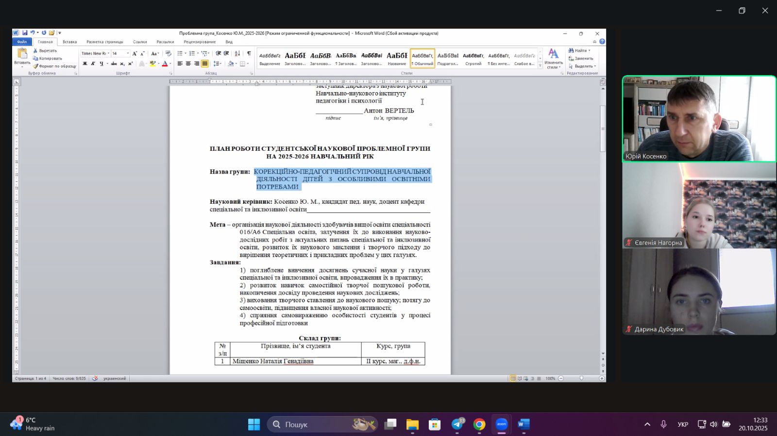 10 жовтня 2025 року у рамках діяльності студентської проблемної групи «Корекційно-педагогічний супровід навчальної діяльності дітей з особливими освітніми потребами» доцентом Юрієм Косенком було проведено засідання. Метою зустрічі було планування подальшої науково-дослідної роботи, визначення напрямів досліджень і організація роботи учасників групи.