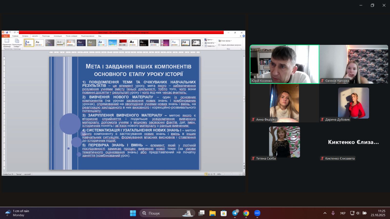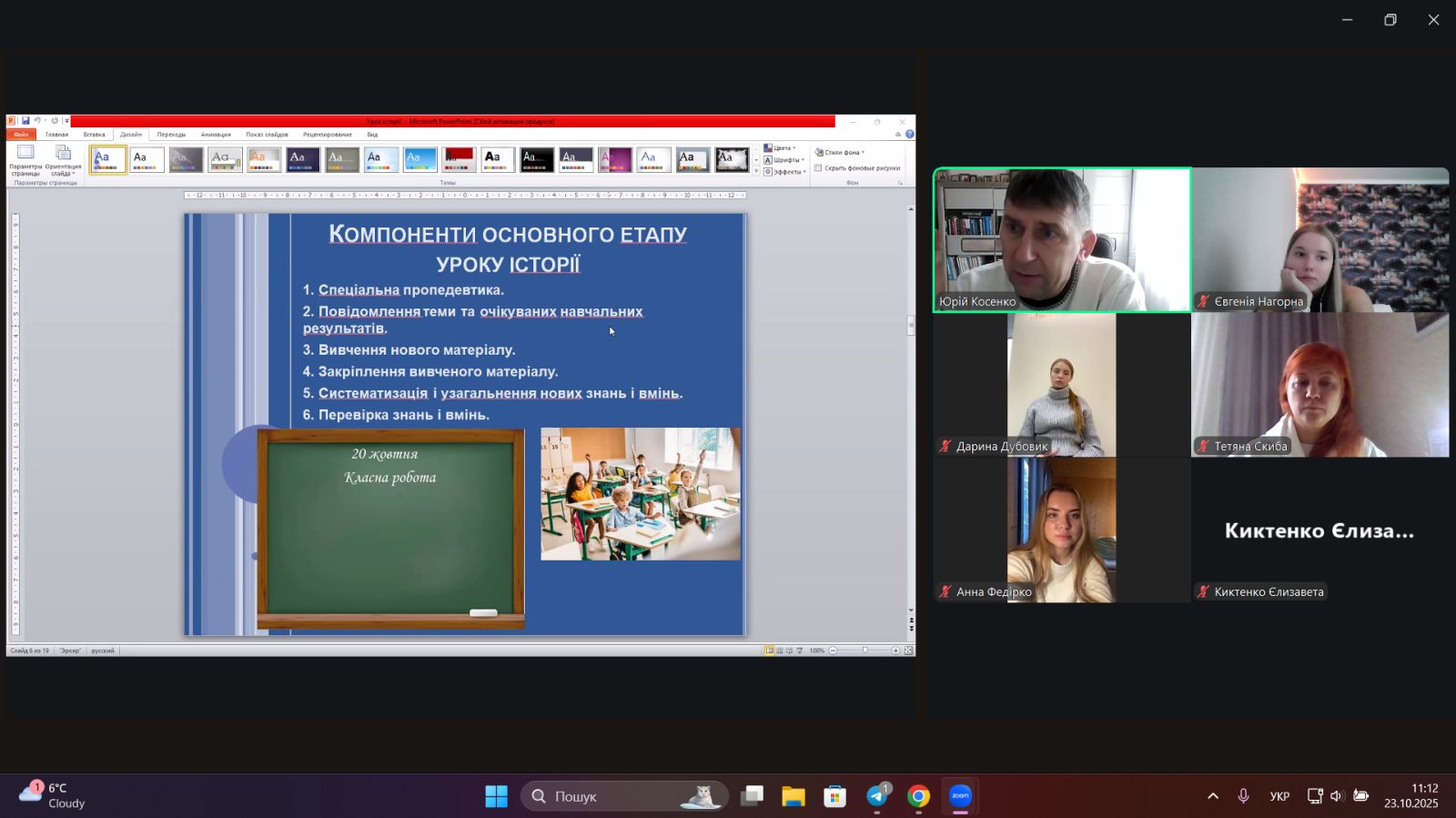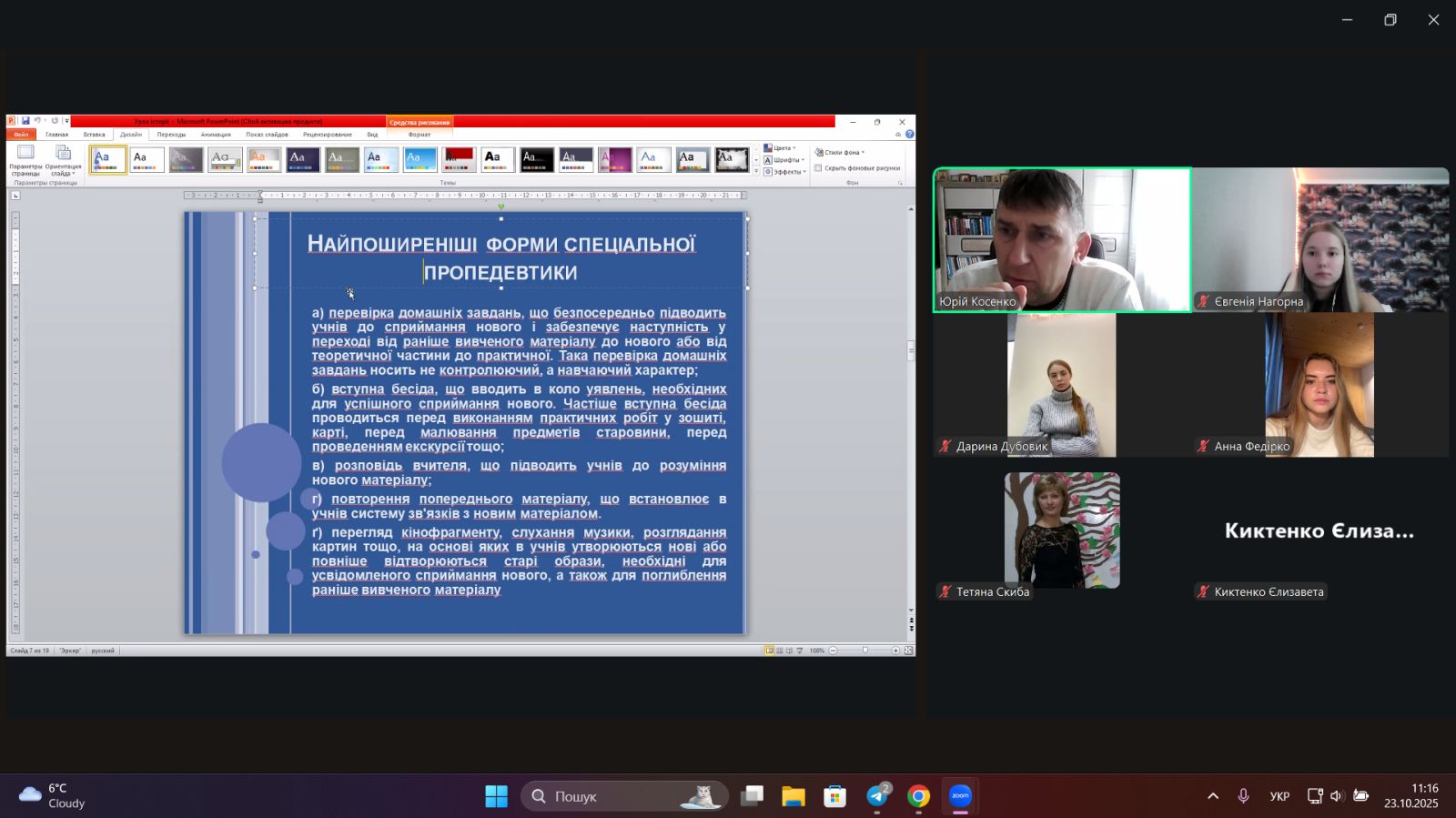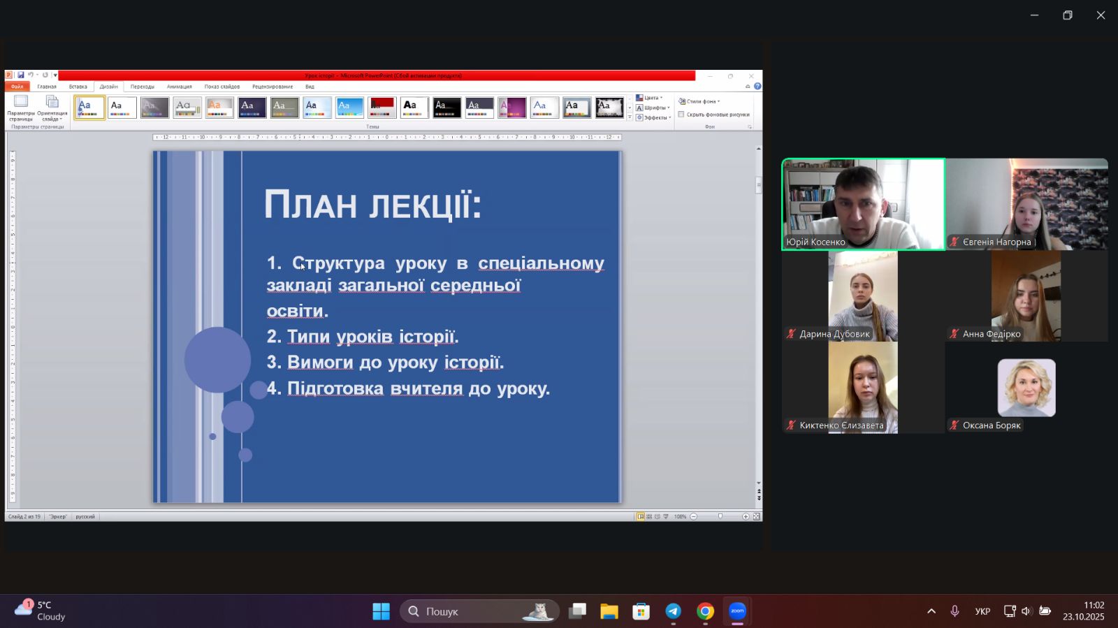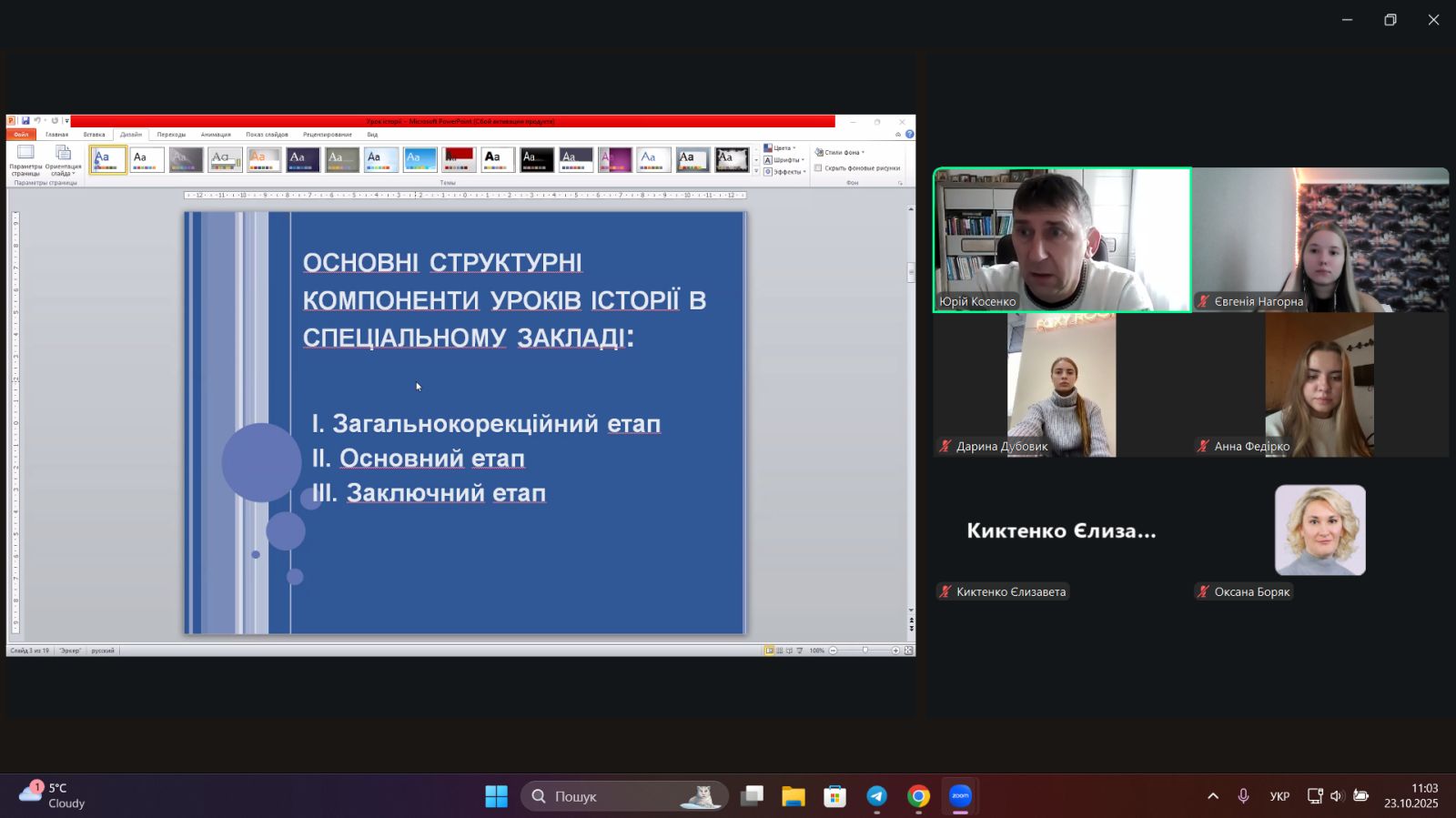 23 жовтня 2025 року доцентом кафедри спеціальної та інклюзивної освіти Юрієм КОСЕНКОМ було проведено відкриту лекцію для здобувачів освіти 0041 групи з навчальної дисципліни «Спеціальна методика історії» на тему «Урок як основна форма навчання історії учнів з порушеннями інтелекту».