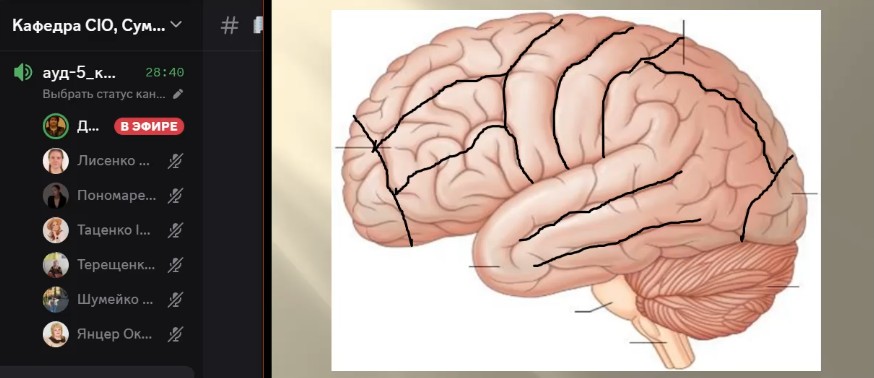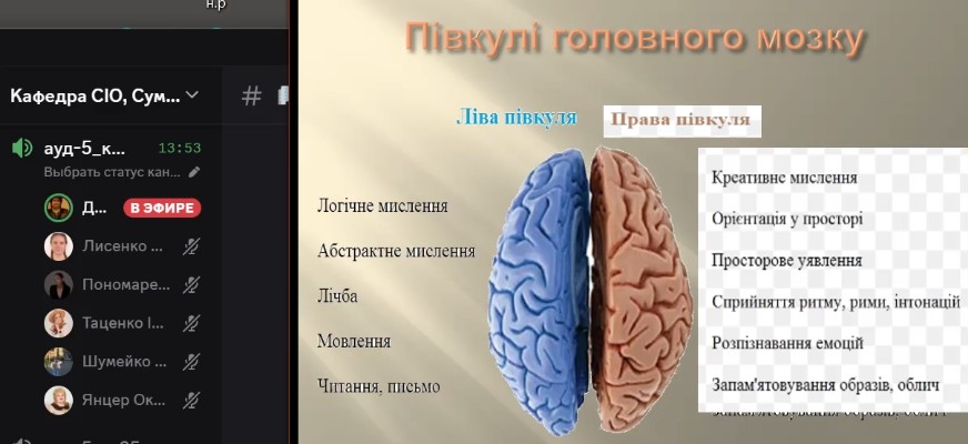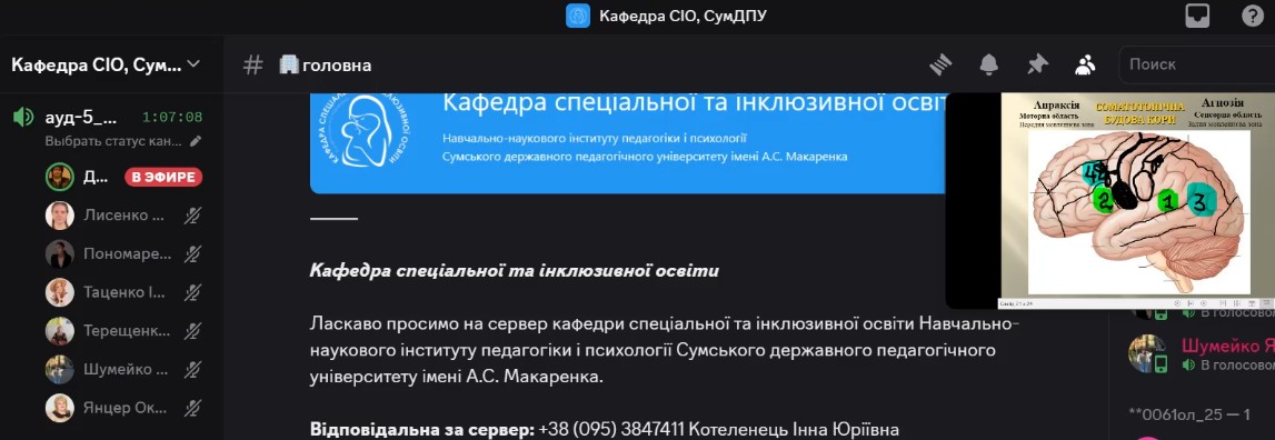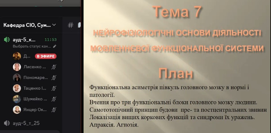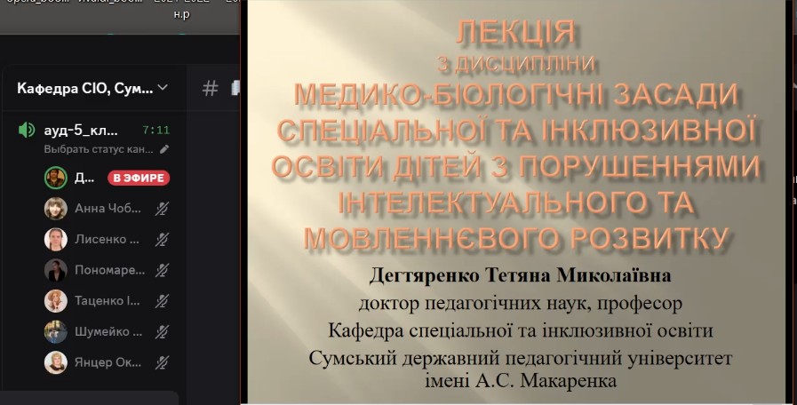 зі студентами академічної групи 0051кп денної форми навчання спеціальності A6 Спеціальна освіта (освітньо-професійна програма Корекційна психопедагогіка. Логопедія) з навчальної дисципліни «Медико-біологічні засади спеціальної та інклюзивної освіти дітей з порушеннями інтелектуального та мовленнєвого розвитку» на тему: «Нейрофізіологічні основи діяльності мовленнєвої функціональної системи». Лекція відбулася в онлайн форматі на сервері кафедри спеціальної та інклюзивної освіти на платформі Discord.