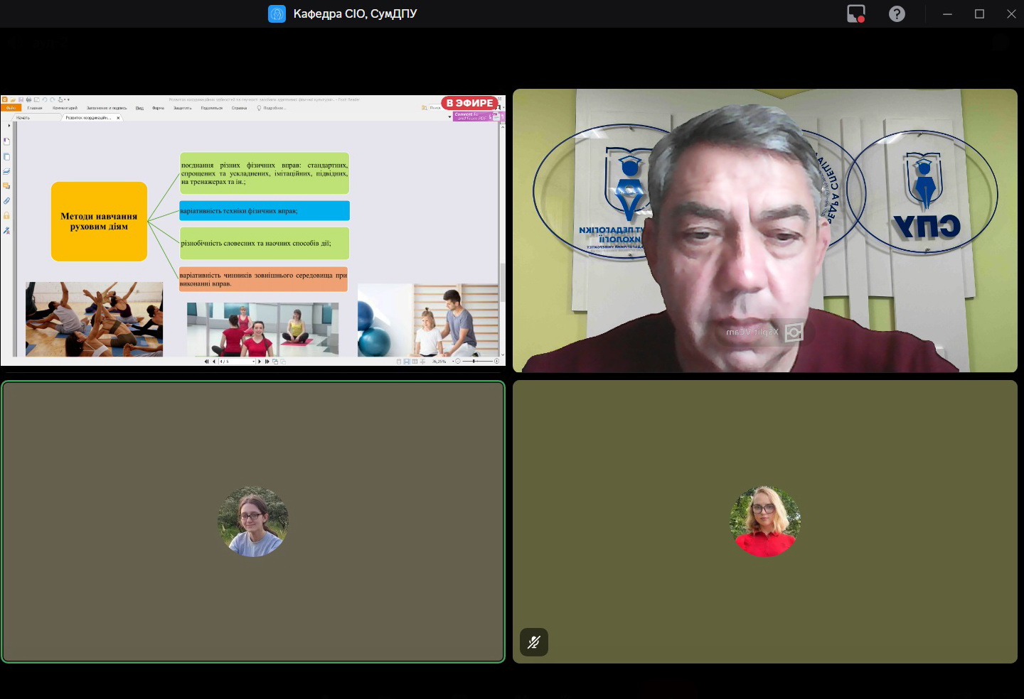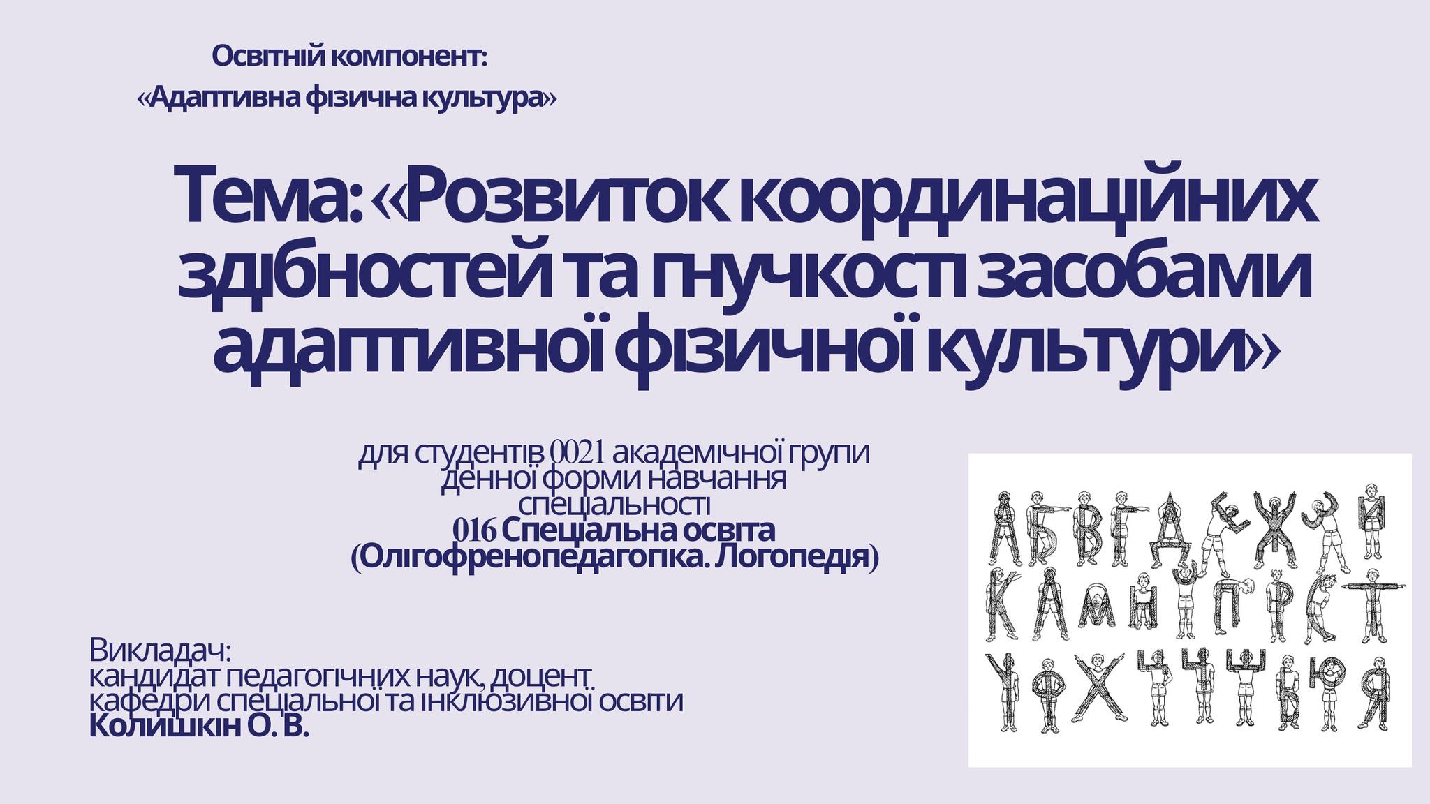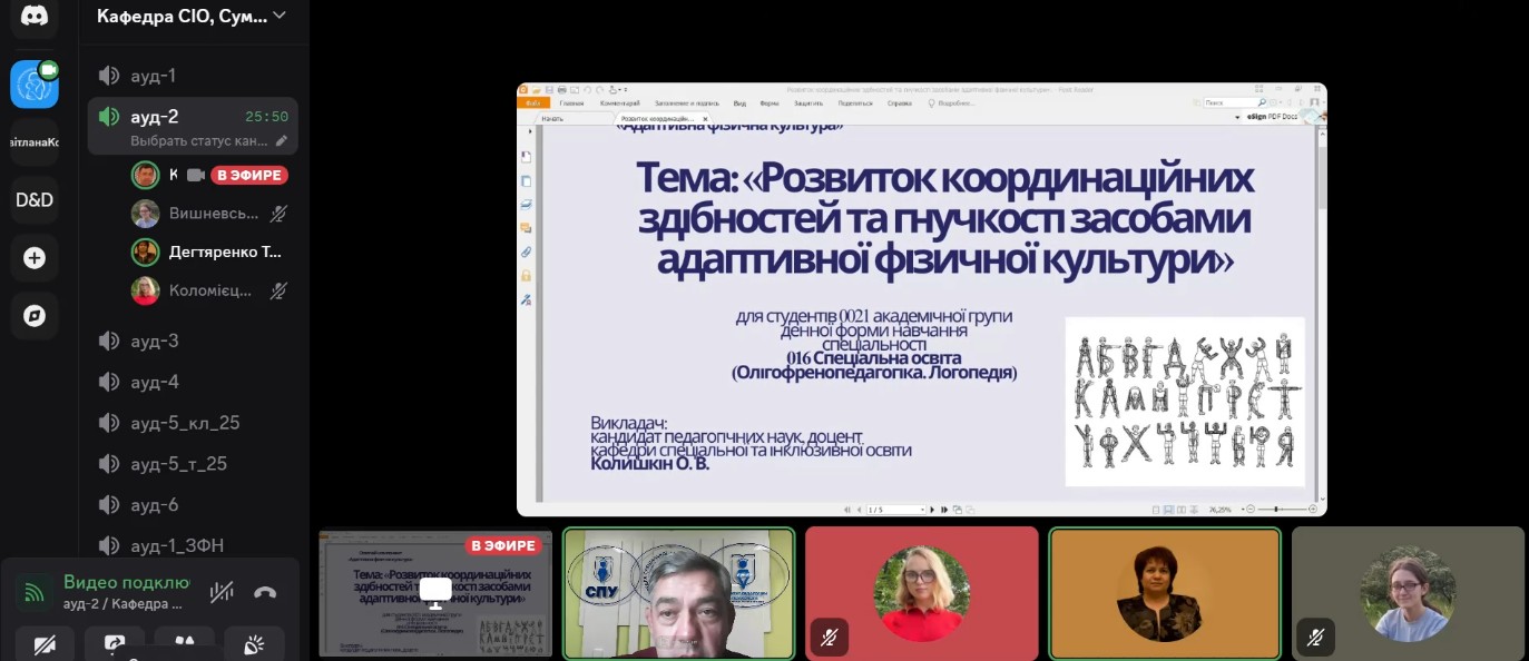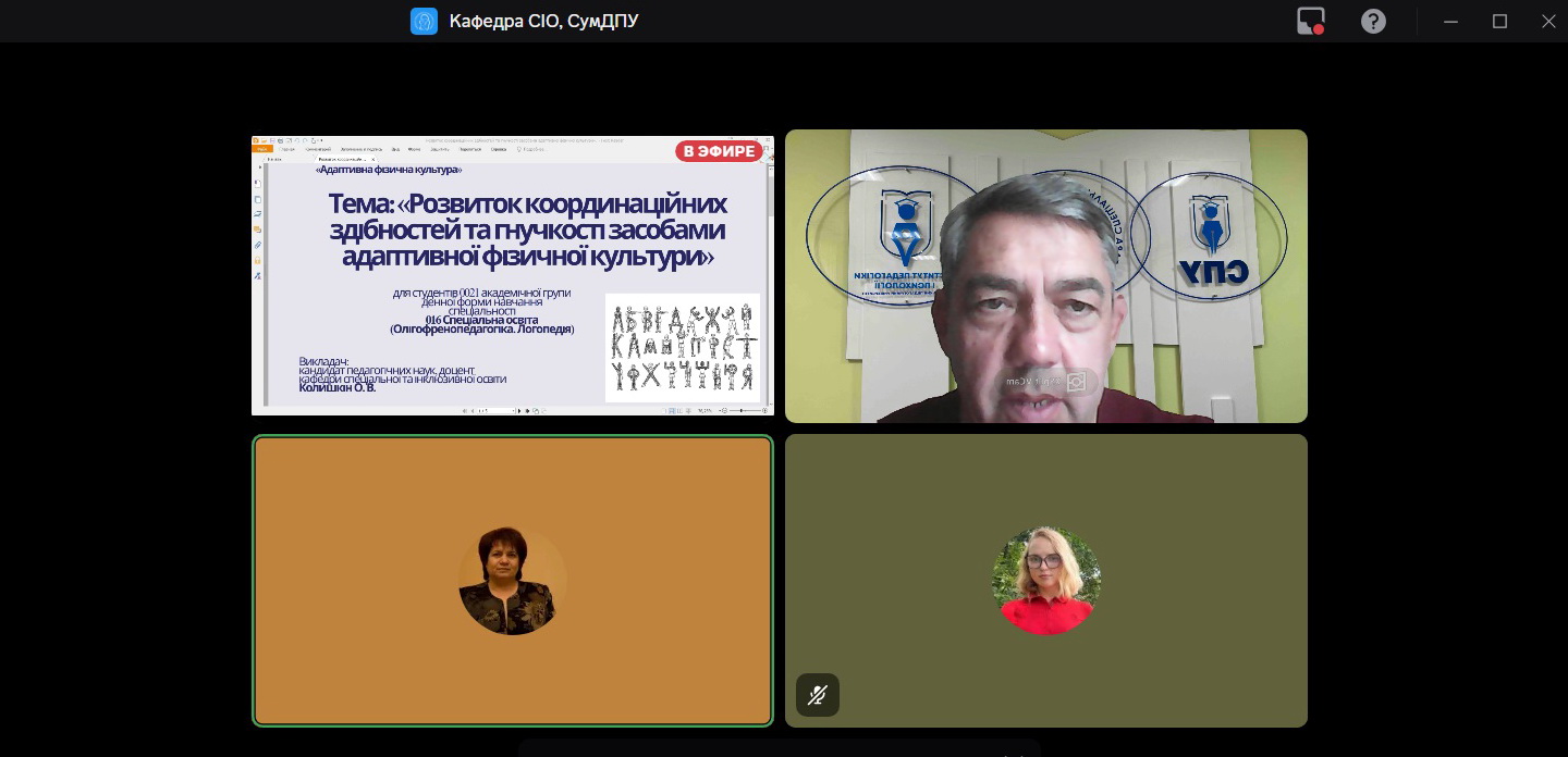 18 листопада 2025 року канд. пед. наук, доцентом кафедри спеціальної та інклюзивної освіти Олександром КОЛИШКІНИМ було проведено відкрите лекціне заняття зі студентами 0021 групи денної форми навчання спеціальності 016 Спеціальна освіта (Корекційна психопедагогіка. Логопедія) з навчальної дисципліни «Адаптивна фізична культура» на тему: «Розвиток координаційних здібностей та гнучкості засобами адаптивній фізичній культури». На онлайн-занятті були присутні завідувач кафедри спеціальної та інклюзивної освіти, доктор пед. наук, професор Оксана БОРЯК, доктор пед. наук, професор Тетяна ДЕГТЯРЕНКО, канд. психол. наук, доцент Анна ЧОБАНЯН.
