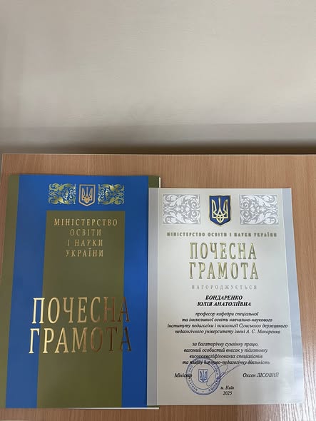 Професорсько-викладацький склад кафедри вітає професора кафедри, доктора педагогічних наук, професора Юлію Анатоліївну БОНДАРЕНКО з високою відзнакою - Почесною грамотою Міністерства освіти і науки України за багаторічну сумлінну працю, особистий внесок у підготовку висококваліфікованих спеціалістів та плідну науково-педагогічну діяльність (грудень 2025 року).