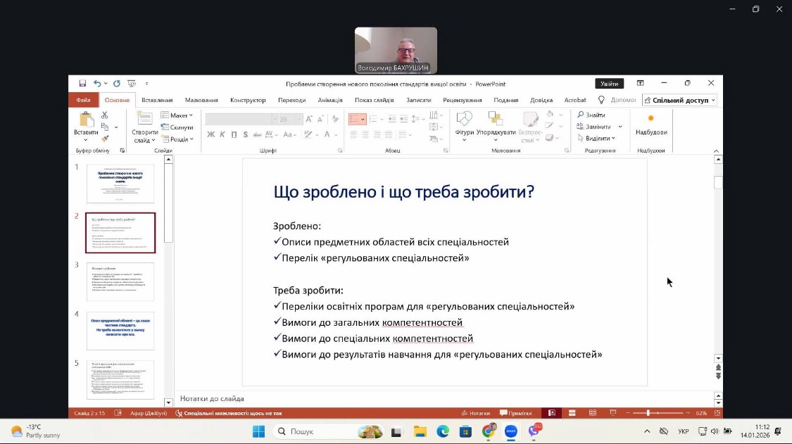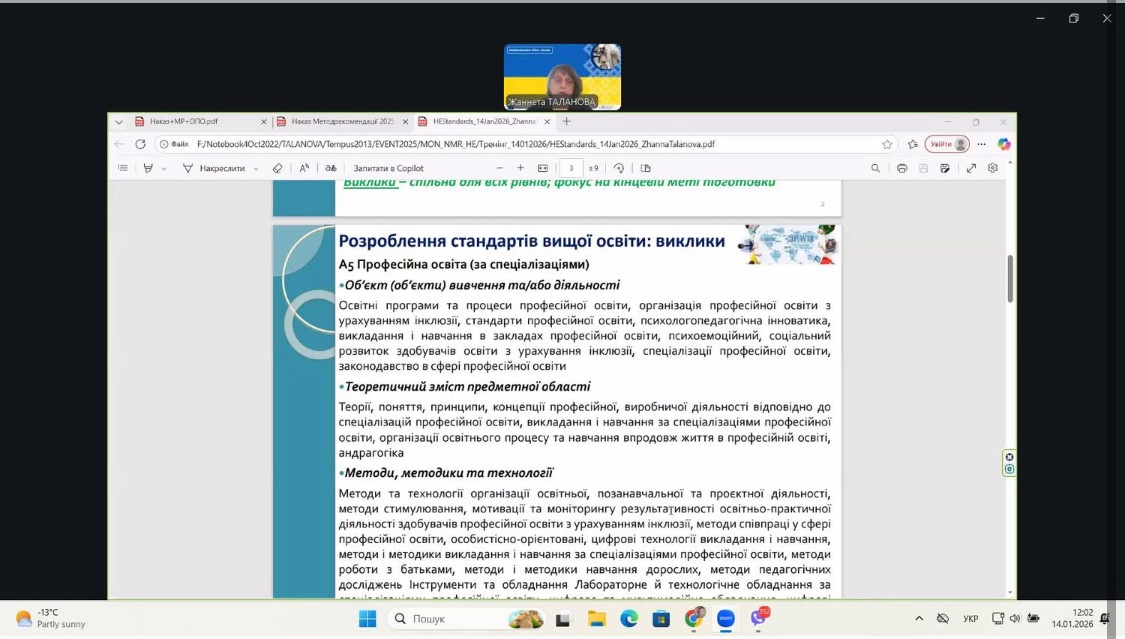 14 січня 2026 року професор Юлія БОНДАРЕНКО разом з іншими членами підкомісії А6 Спеціальна освіта сектору вищої освіти НМР МОН України взяла участь в онлайн-тренінгу щодо розроблення стандартів вищої освіти, де ознайомилася з стратегією розроблення стандартів вищої освіти нового покоління, освітніх програм для регульованих та нерегульованих спеціальностей.