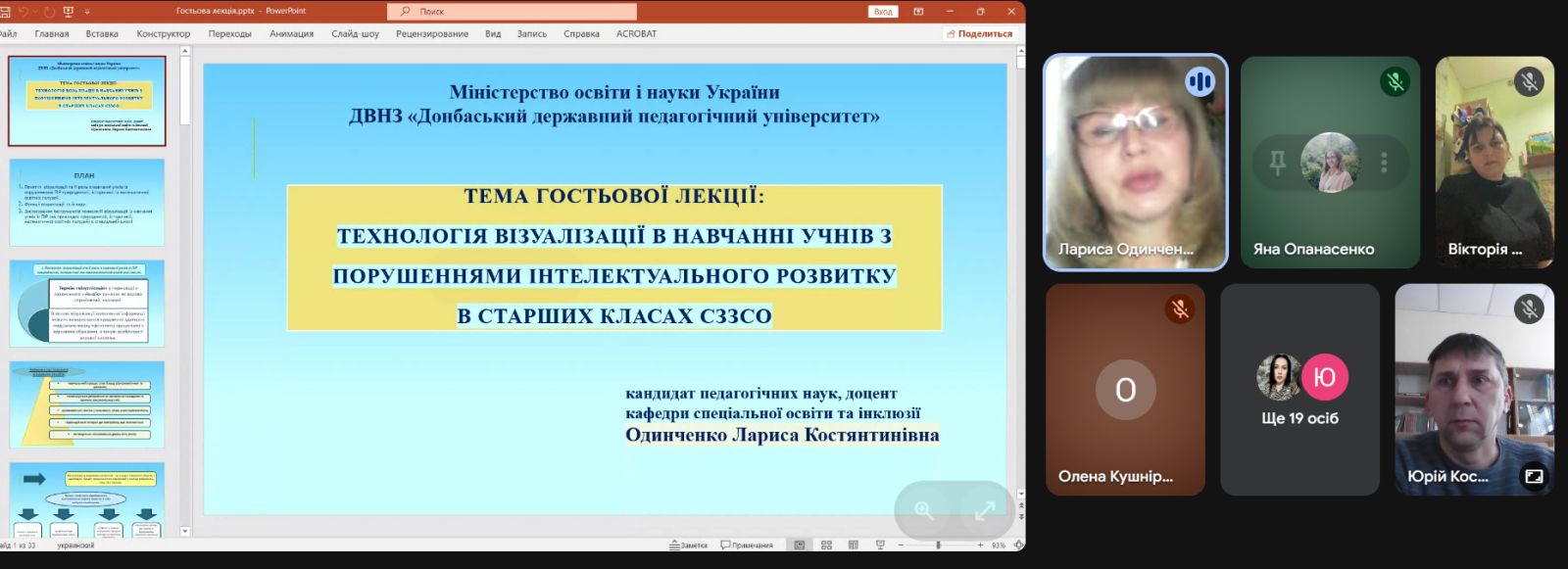 03 березня 2026 року для здобувачів І курсу магістратури спеціальності А6 Спеціальна освіта було проведено гостьову лекція на тему «Технологія візуалізації в навчанні учнів з порушеннями інтелектуального розвитку в старших класах СЗЗСО». Лекцію провела доцент кафедри спеціальної освіти та інклюзії Донбаського державного педагогічного університету Одинченко Лариса Костянтинівна.