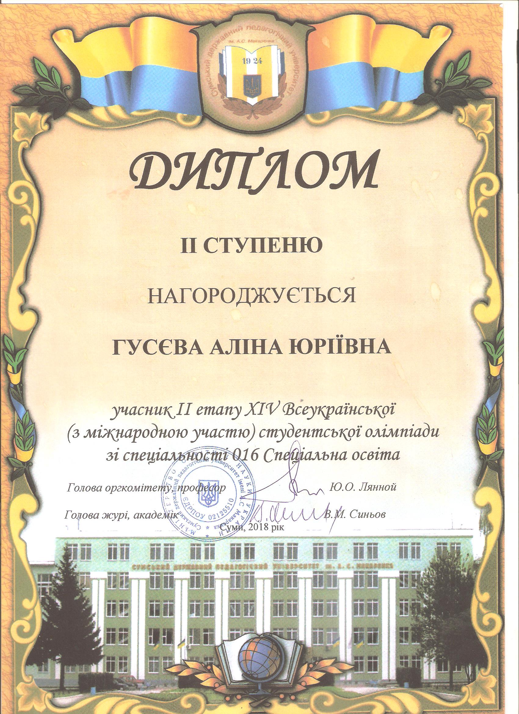 24-25 квітня 2018 року в Сумському державному педагогічному університеті імені А. С. Макаренка відбувся ІІ етап Всеукраїнської (з міжнародною участю) студентської олімпіади зі спеціальності 016 Спеціальна освіта (за нозологіями). Студентка кафедри спеціальної та інклюзивної освіти Гусєва А. Ю. (науковий керівник – кандидат педагогічних наук, доцент Боряк О. В.) здобула ІІ місце та нагороджена Дипломом ІІ ступеня Міністерства освіти та науки.