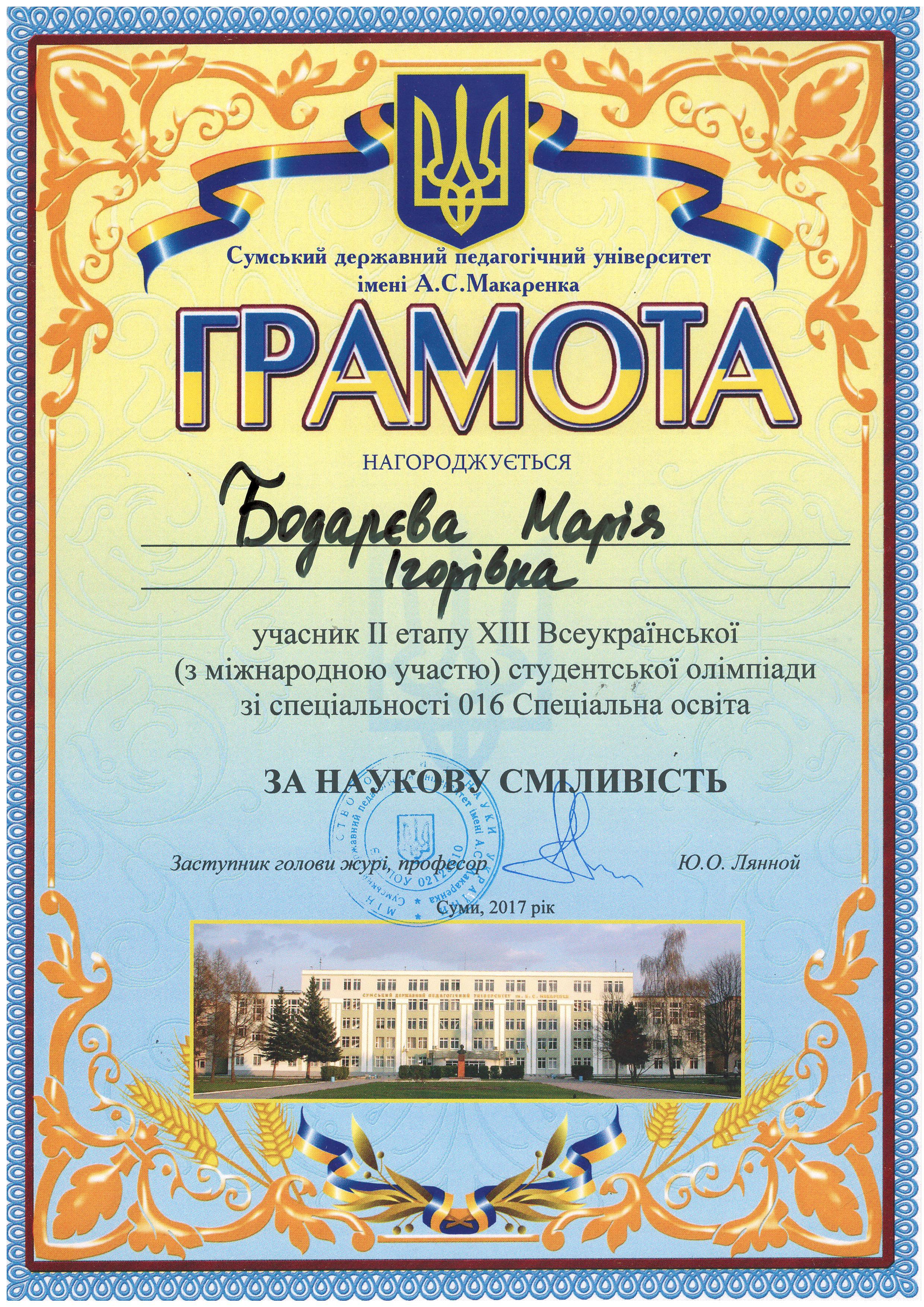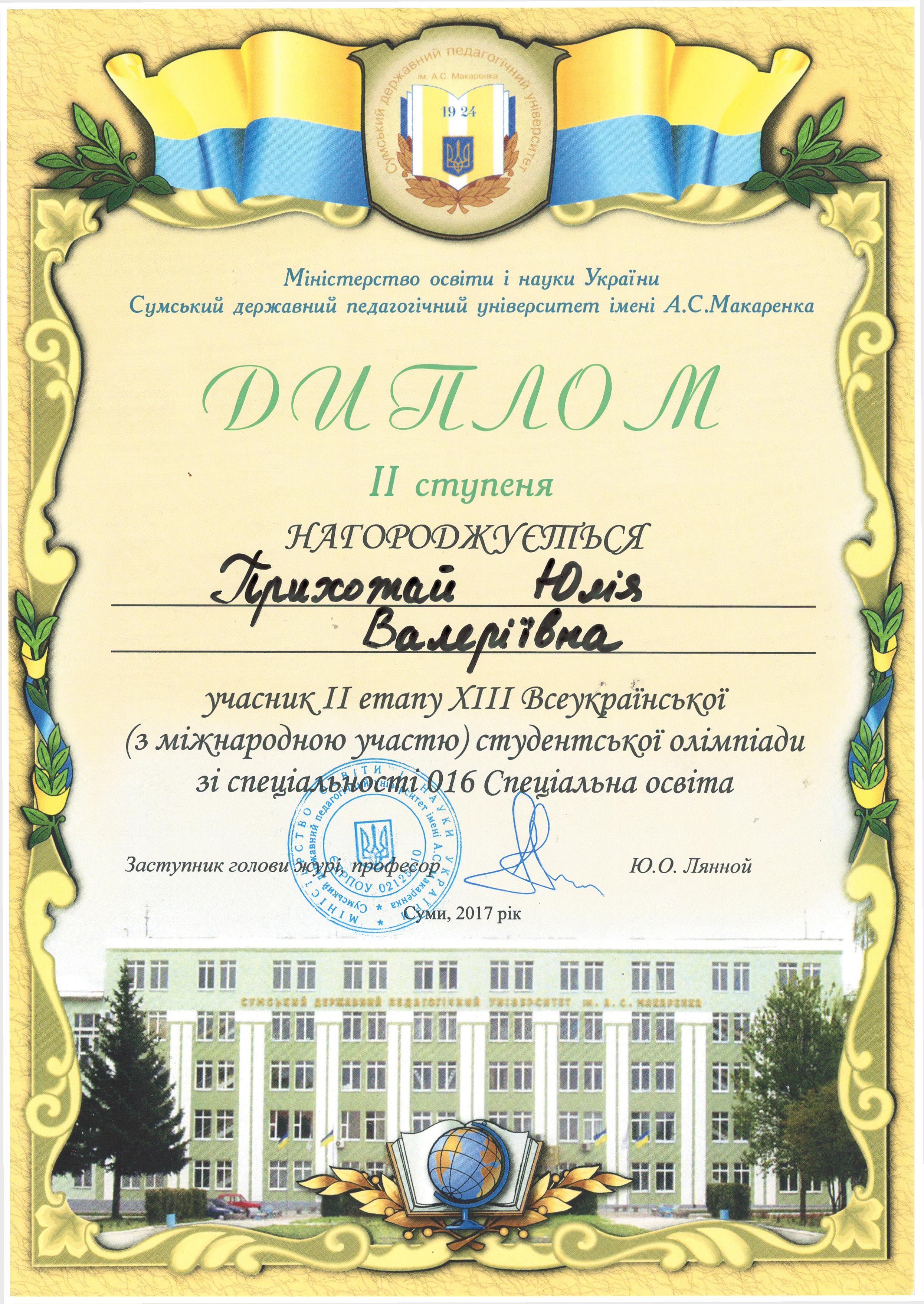 23-24 березня 2017 р. в Сумському державному педагогічному університеті імені А. С. Макаренка відбувся ІІ етап ХІІІ Всеукраїнської (з міжнародною участю) студентської олімпіади зі спеціальності 016 Спеціальна освіта. Організацію і проведення Олімпіади здійснювала кафедра корекційної та інклюзивної освіти Навчально-наукового інституту педагогіки і психології.